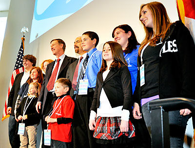 A couple hours after he was sworn in as Colorado’s 42nd governor, John Hickenlooper made the trip back across Civic Center Park to congratulate nine students, along with classmates, teachers and family members, for their winning visions of the state. Joined by newly minted Lt. Gov. Joe Garcia and a slew of Colorado-based achievers, Hickenlooper told the youngsters to aim high at a celebratory luncheon on Tuesday at the Denver Art Museum.“You’re going to be the ones to move this state forward in the 21st Century,” Hickenlooper said before commiserating over the bitter cold that shrouded his inaugural ceremony, also attended by the contest winners and their entourages.
