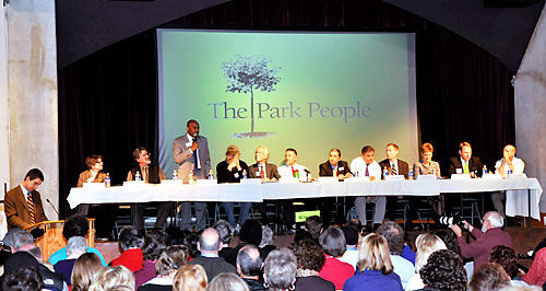 An audience of more than 300 over-flowed Mitchell Hall at the Botanic Gardens to hear the mayoral hopefuls answer questions about the city’s parks at the forum, sponsored by The Parks People organization.