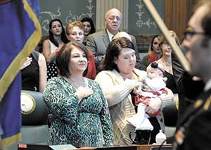Hullinghorst took over from Denver Democrat Mark Ferrandino, who became the first openly gay speaker of the House two years ago, and was term-limited. Ferrandino presided over the initial proceedings, gaveling the chamber to order and dispatching a delegation to summon Colorado Supreme Court Chief Justice Nancy Rice, who swore in the lawmakers en masse and later posed for photographs with legislators while the House waited on the Senate to catch up with the day’s business.