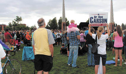 Carson is one of 17 candidates in a GOP primary that is a source of entertainment and confusion and exhaustion. The contest has been running all year and the first real electoral test, the Iowa caucus, won’t happen for another five months. Add to that the theatrical hail storm, the fact that the candidate was flying in from an event held just hours before in Arkansas and the sad crackle-hum-silence filling the air at America the Beautiful Park that signaled the sound system was on the blink. When it came time to open the proceedings, U.?S. Rep. Doug Lamborn climbed the stage and did his best with a megaphone, shouting out introductory remarks that were as clear as mud from the wet field.