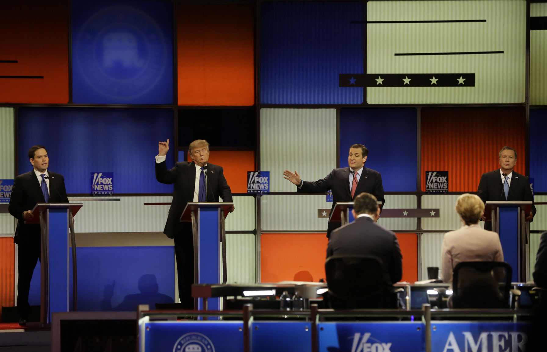 The two senators, who in earlier debates had devoted considerable time to throwing sharp elbows at one another, pressed Trump aggressively on his conservative credentials, his business practices and changing policies.