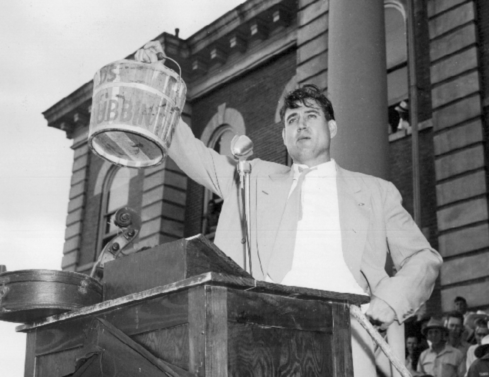 “Big Jim got up on that block and sang a song,” people said anytime the town’s enduring block of concrete was mentioned. The Strawberry Pickers, Gov. Big Jim Folsom‘s hillbilly band, played banjo and fiddle as Big Jim sang the Bill Monroe song “Y’all Come.”