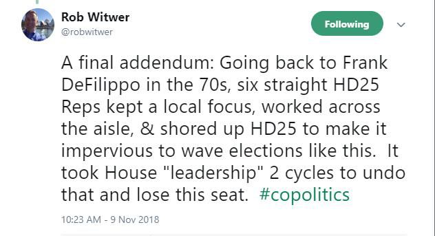 Blast from the past, with a post-mortem on the election: Rep.-elect Lisa Cutter of Littleton is the first Democrat in state history to hold the House District 25 seat in west Jefferson County, according to former Republican state Rep. Rob Witwer of Genesee, who represented the district from 2005 to 2008.