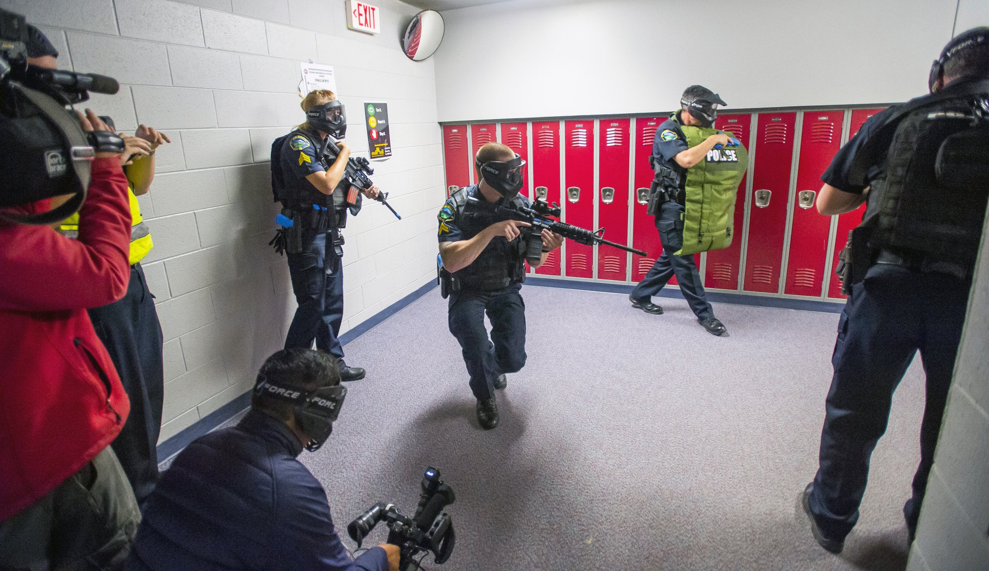 Teachers and students practice fleeing and hiding during realistic shooter scenarios inside school buildings fortified by bolted doors, bulletproof glass and security cameras.