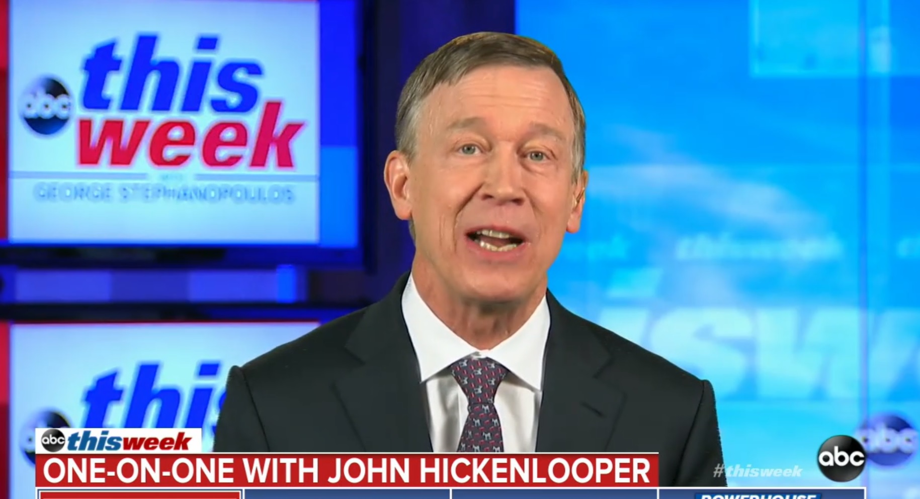 On “This Week,” Hickenlooper also sounded a favorite theme, saying that he’s the one out of close to two dozen Democrats running for president who has “spent my whole life bringing people together and getting big progressive things done.”