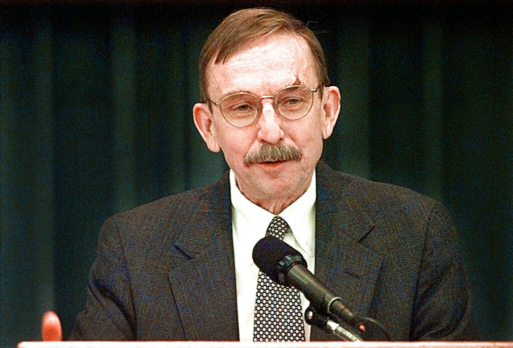 In this Dec. 12, 1995, file photo, U.S. Federal Judge Richard Matsch is swarmed by reporters and photographers as he arrives at Will Rogers World Airport in Oklahoma City. Matsch, the no-nonsense federal judge who gained national respect overseeing the Oklahoma City bombing trials died on Sunday, May 26, 2019, Jeffrey Colwell, the clerk of Colorado's federal court said. He was 88.