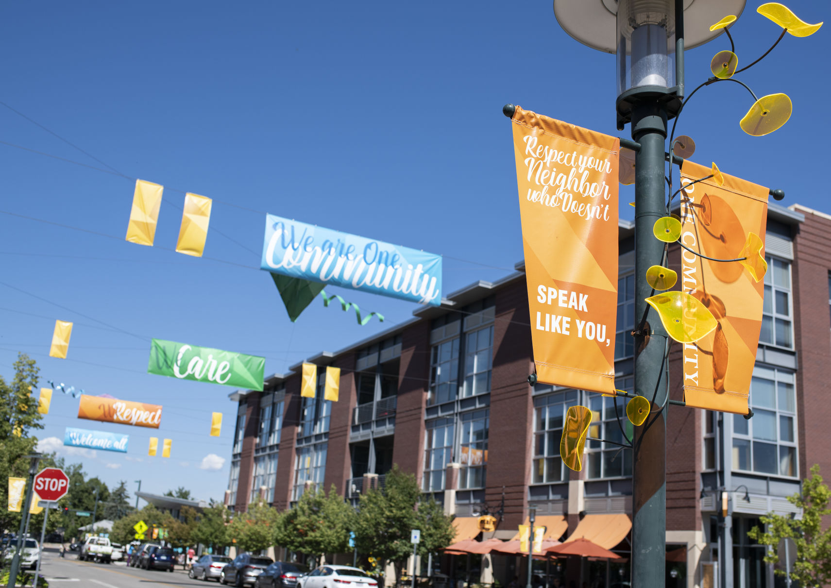 And on the lamp posts are a set of smaller banners that declare “Respect your neighbor…”