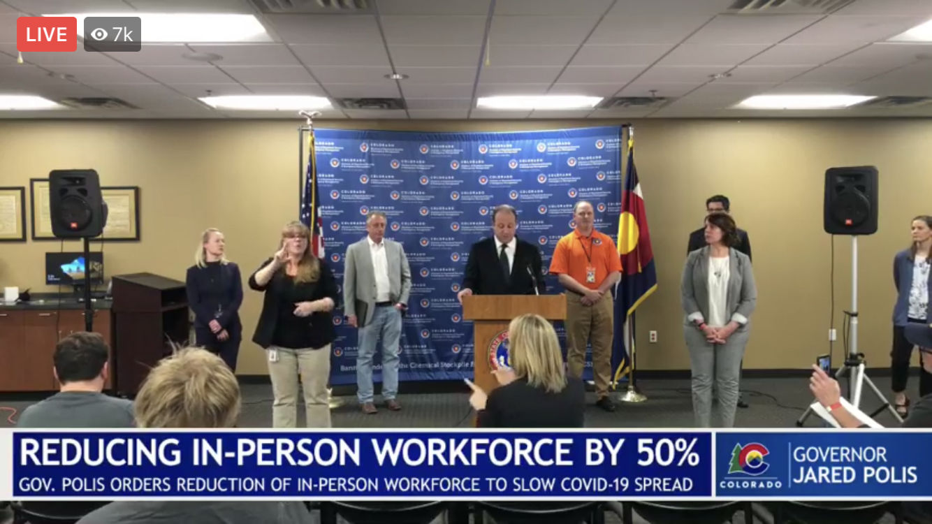 Gov. Jared Polis, in a first-ever Sunday news conference, ordered non-essential businesses to reduce their on-site workforce by 50% by Tuesday, stopping just short of ordering a full-scale “stay at home” order.