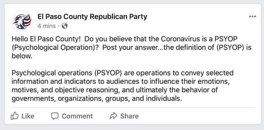 “Hello El Paso County! Do you believe that the Coronavirus is a PSYOP (Psychological Operation)? Post your answer… the definition of (PSYOP) is below,” the post read, followed by a passage that appears to have been copied from Wikipedia: “Psychological operations (PSYOP) are operations to convey select information and indicators to audiences to influence their emotions, motives, and objective reasoning, and ultimately the behavior of governments, organizations, groups, and individuals.”