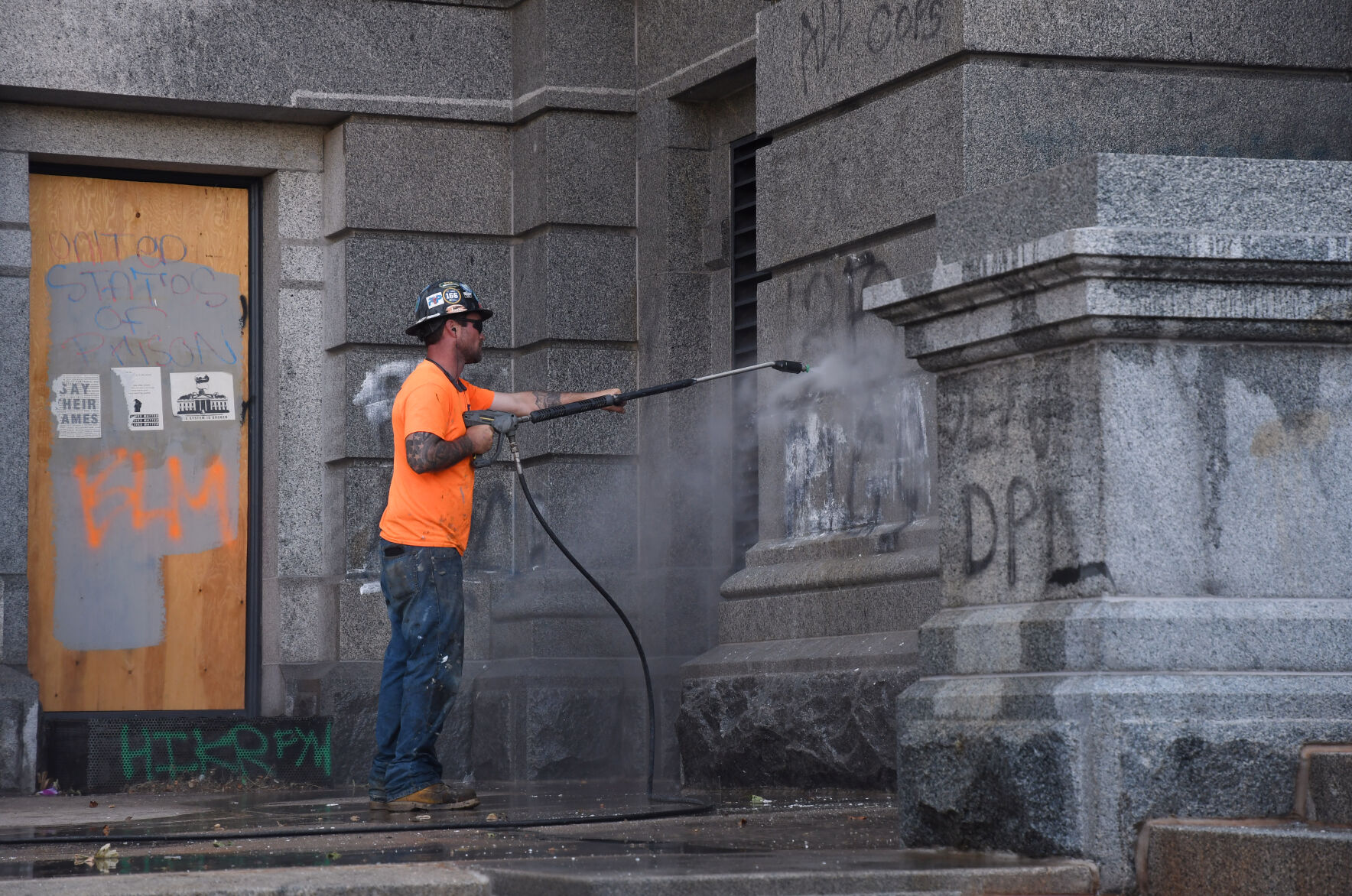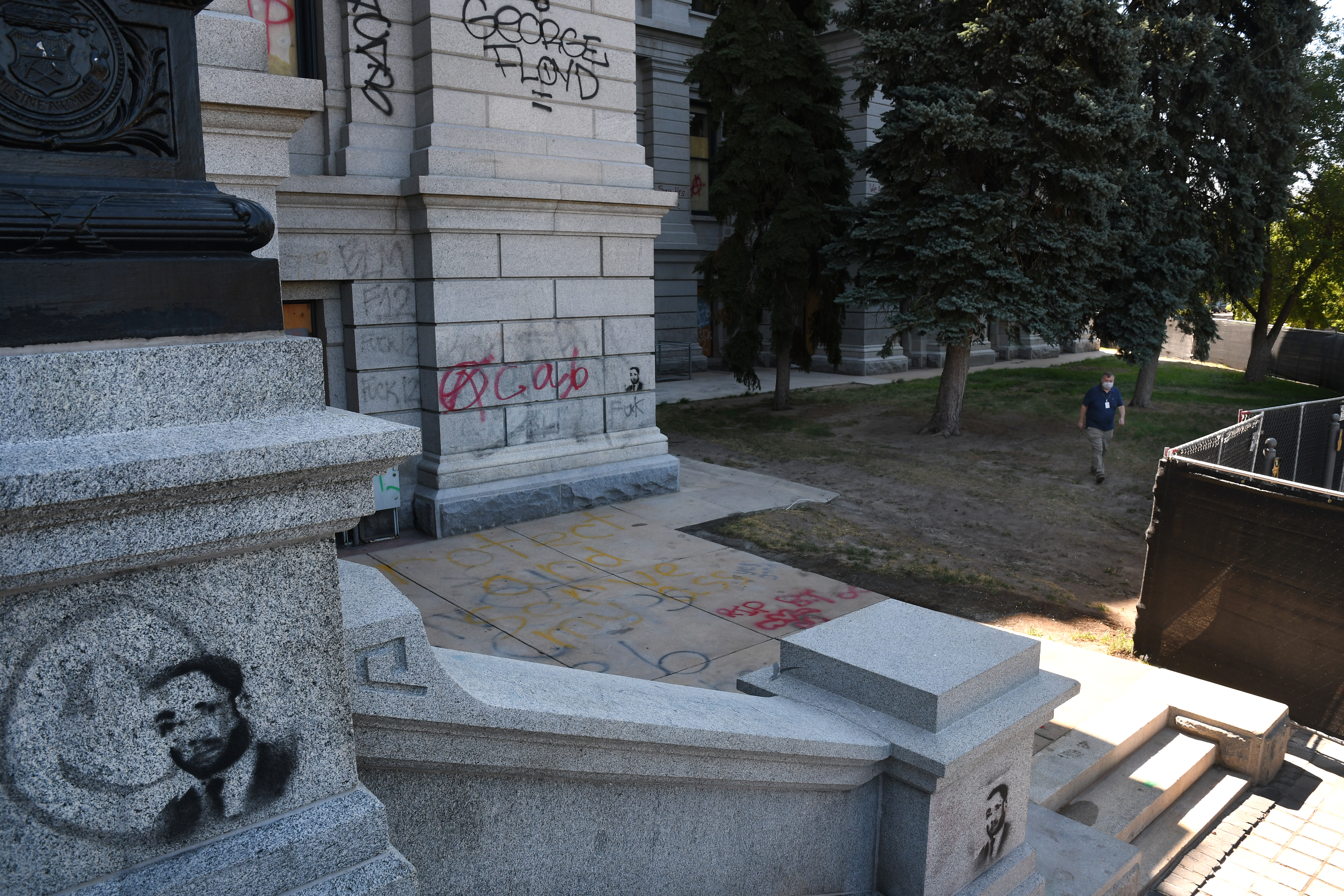 Crews apply a chemical wash on the graffiti and let it sit for a time before using a power sprayer in hopes of removing the markings. With fencing recently erected around the perimeter of the Colorado state capitol building, crews continue the cleanup of graffiti painted on the building’s facade on July 20, 2020, in Denver.Kathryn Scott, special to Colorado PoliticsWith fencing recently erected around the perimeter of the Colorado state capitol building, crews continue the cleanup of graffiti painted on the building’s facade on July 20, 2020, in Denver.Kathryn Scott, special to Colorado PoliticsCrews apply a chemical wash on the graffiti and let it sit for a time before using a power sprayer in hopes of removing the markings. With fencing recently erected around the perimeter of the Colorado state capitol building, crews continue the cleanup of graffiti painted on the building’s facade on July 20, 2020 in Denver.Kathryn Scott, special to Colorado PoliticsDoug Platt, public information officer for the Colorado Department of Personnel and Administration, talks about the challenges of cleaning effort. With fencing recently erected around the perimeter of the Colorado state capitol building, crews continue the cleanup of graffiti painted on the building’s facade on July 20, 2020, in Denver.Kathryn Scott, special to Colorado PoliticsThe graffiti in this area at the top of the west steps has already been chemically treated and washed 2-3 times, but is still visible. With fencing recently erected around the perimeter of the Colorado state capitol building, crews continue the cleanup of graffiti painted on the building’s facade on July 20, 2020, in Denver.Kathryn Scott, special to Colorado PoliticsDespite the installation of fencing around the building, vandals persisted and painted the markings seen here in red and orange, along with this stencil portrait of Dr. Martin Luther King, Jr. With fencing recently erected around the perimeter of the Colorado state capitol building, crews continue the cleanup of graffiti painted on the building’s facade on July 20, 2020, in Denver.Kathryn Scott, special to Colorado PoliticsDespite the installation of fencing around the building, vandals persisted and painted the markings seen here in red and orange, along with this stencil portrait of Dr. Martin Luther King, Jr. With fencing recently erected around the perimeter of the Colorado state capitol building, crews continue the cleanup of graffiti painted on the building’s facade on July 20, 2020, in Denver.Kathryn Scott, special to Colorado PoliticsDespite the installation of fencing around the building, vandals persisted and painted the markings seen here in red. With fencing recently erected around the perimeter of the Colorado state capitol building, crews continue the cleanup of graffiti painted on the building’s facade on July 20, 2020, in Denver.Kathryn Scott, special to Colorado PoliticsDespite the installation of fencing around the building, vandals persisted and painted the markings seen here in red and orange, along with this stencil portrait of Dr. Martin Luther King, Jr. With fencing recently erected around the perimeter of the Colorado state capitol building, crews continue the cleanup of graffiti painted on the building’s facade on July 20, 2020, in Denver.Kathryn Scott, special to Colorado PoliticsCrews apply a chemical wash on the graffiti and let it sit for a time before using a power sprayer in hopes of removing the markings. With fencing recently erected around the perimeter of the Colorado state capitol building, crews continue the cleanup of graffiti painted on the building’s facade on July 20, 2020, in Denver.Kathryn Scott, special to Colorado PoliticsDENVER, CO – JULY 20: Crews apply a chemical wash on the graffiti and let it sit for a time before using a power sprayer in hopes of removing the markings. With fencing recently erected around the perimeter of the Colorado state capitol building, crews continue the cleanup of graffiti painted on the building’s facade on July 20, 2020 in Denver, Colorado. (Photo By Kathryn Scott)Kathryn ScottOne of the plaques that appeared on the four sides of the pedestal on the Civil War monument on the west side of the statehouse was torn off by vandals. So the remaining three plaques, as well as others, were removed by officials before they could be taken. With fencing recently erected around the perimeter of the Colorado state capitol building, crews continue the cleanup of graffiti painted on the building’s facade on July 20, 2020, in Denver.Kathryn Scott, special to Colorado PoliticsWith fencing recently erected around the perimeter of the Colorado state capitol building, crews continue the cleanup of graffiti painted on the building’s facade on July 20, 2020. in Denver.Kathryn Scott, special to Colorado PoliticsOne of the plaques that appeared on the four sides of the pedestal on the Civil War monument on the west side of the statehouse was torn off by vandals. So the remaining three plaques, as well as others, were removed by officials before they could be taken. With fencing recently erected around the perimeter of the Colorado state capitol building, crews continue the cleanup of graffiti painted on the building’s facade on July 20, 2020 in Denver.Kathryn Scott, special to Colorado Politics