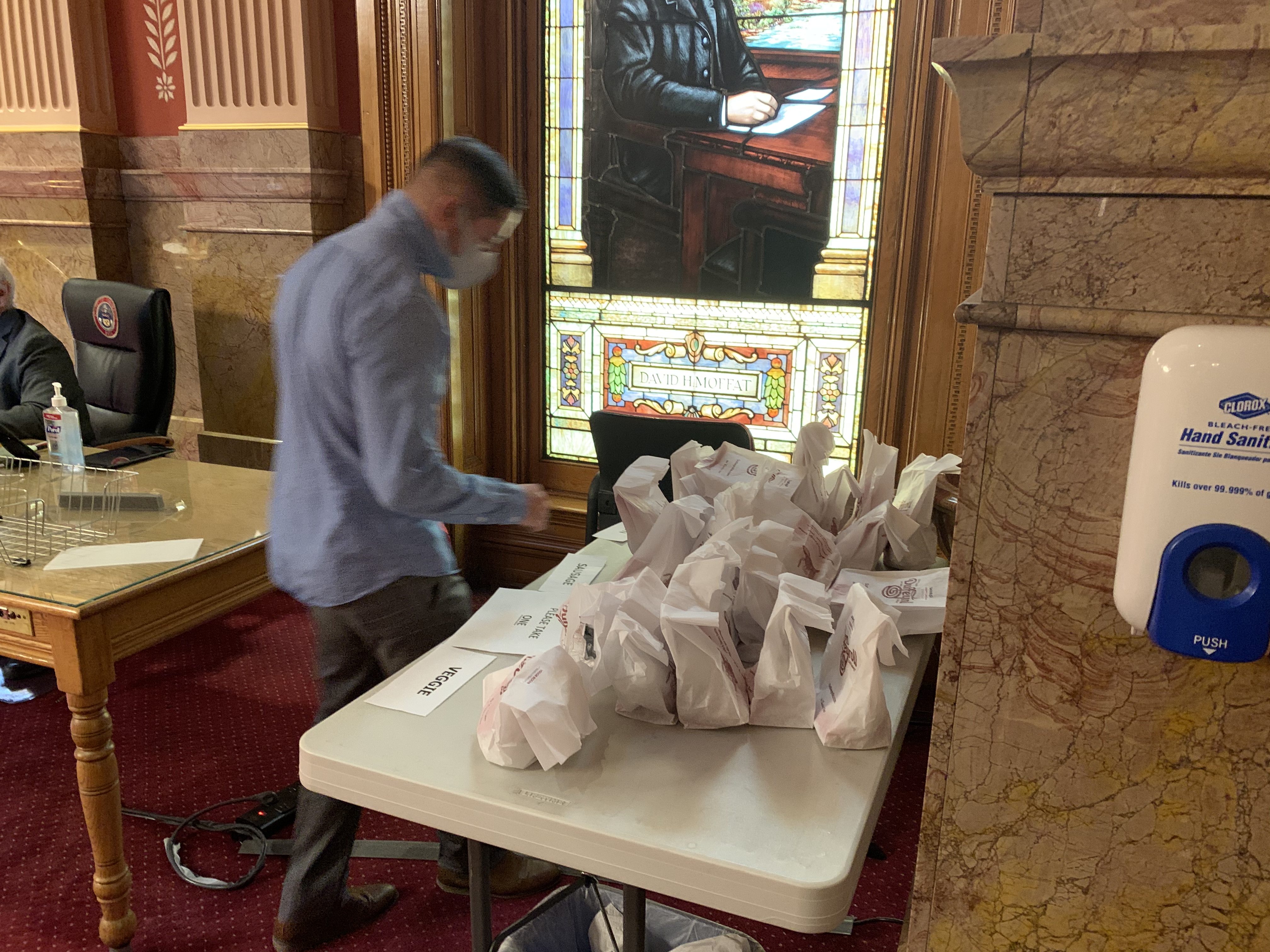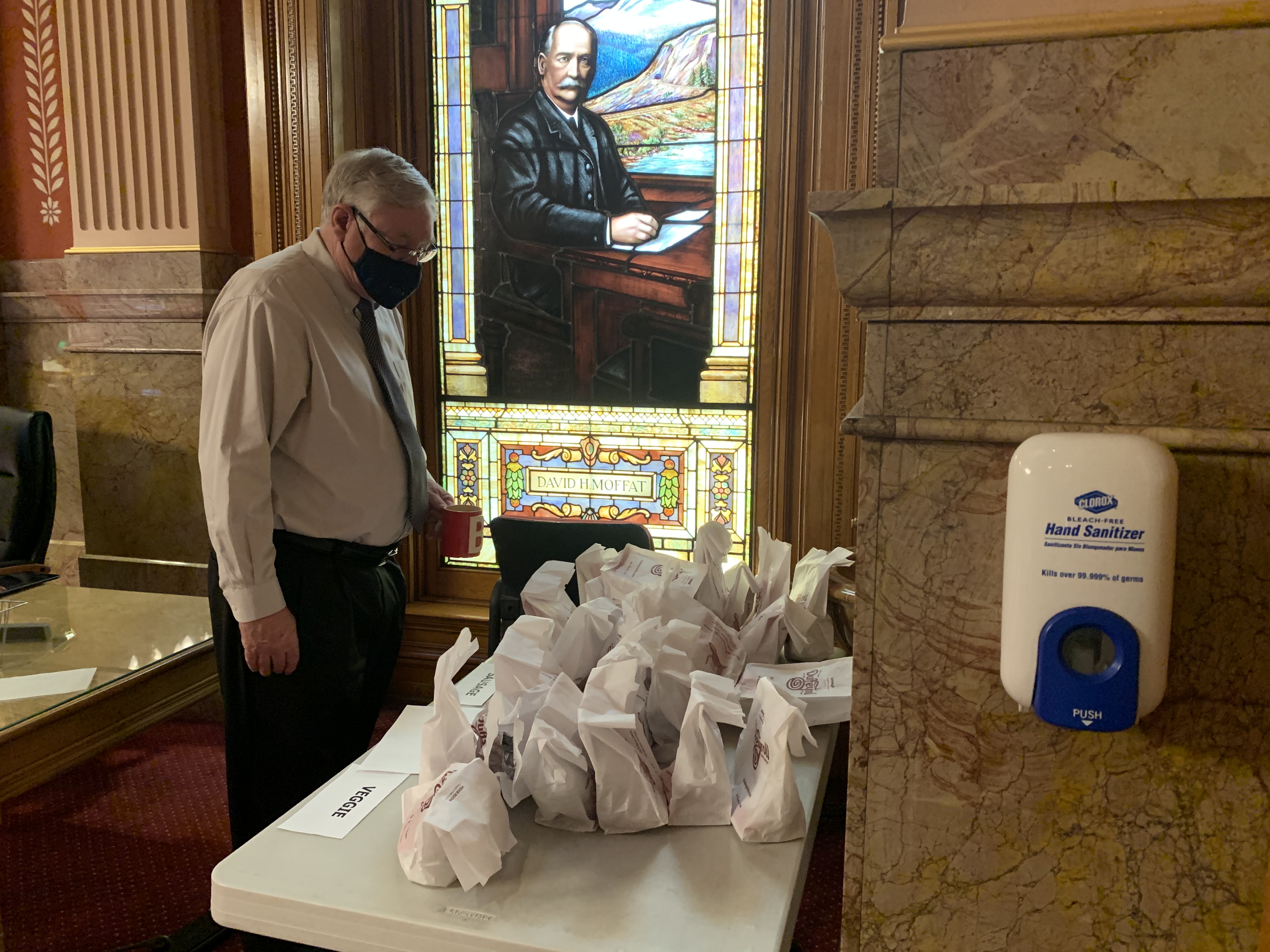 The Senate is starting off its final day by using up the money collected from fines over the last two years – breakfast from Duffy’s, including their famous cinnamon rolls. Saw the car in the parking lot and was more than a little tempted to “help” unload.