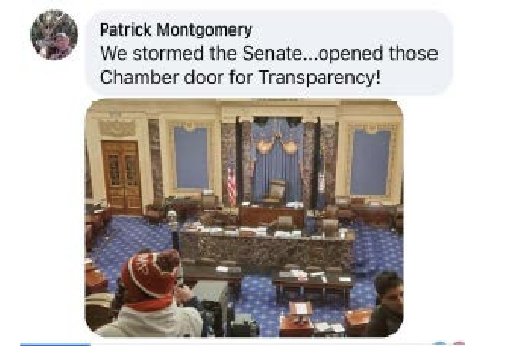 One of the screenshots shows Montgomery posted a photo of the Senate Chamber on Facebook with the caption, “We stormed the Senate…opened those Chamber door for Transparency!”
