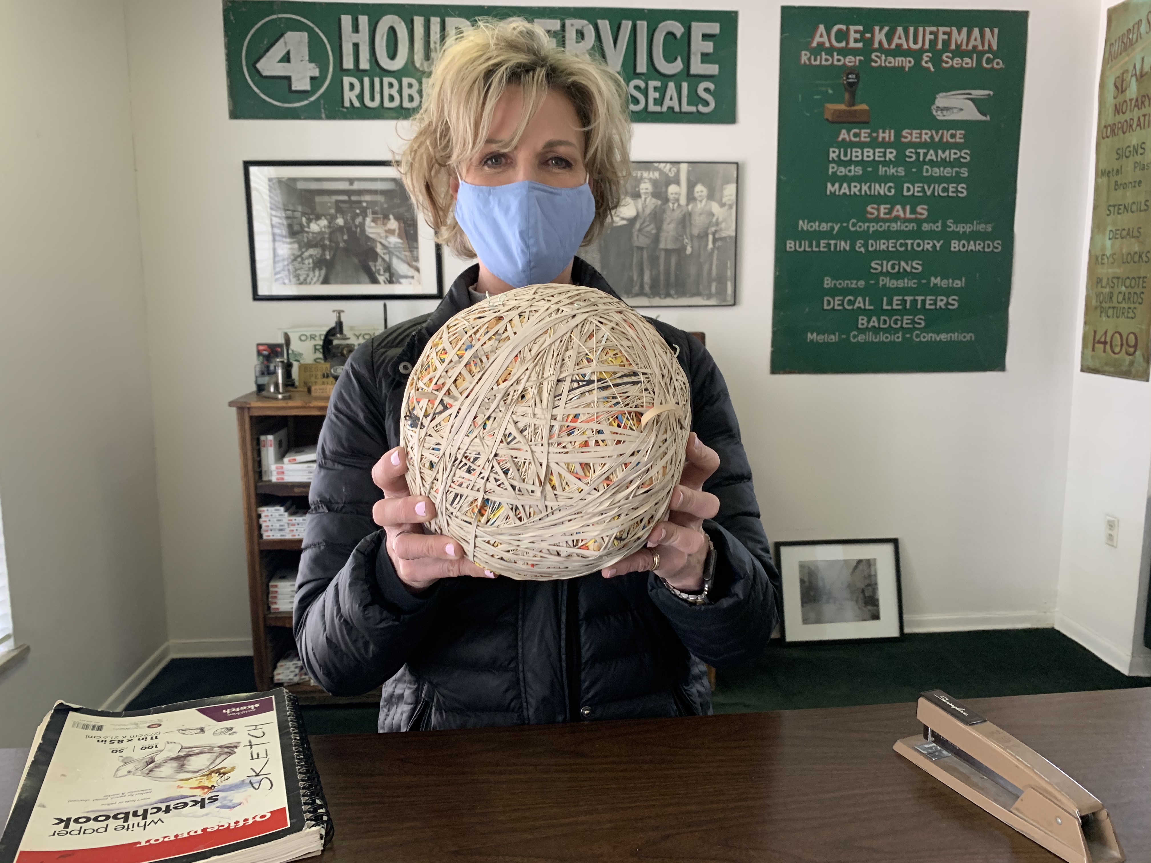 The ball graces the front office of Ace-Kauffman. Hansen continues to add to it but it doesn’t actually grow much from year to year, despite its age. You know what happens when rubber bands get old: they snap and break. Hansen said that sometimes leads to a little commotion. When some of those rubber bands break, it sometimes triggers the building alarm, leading to calls from the alarm company.