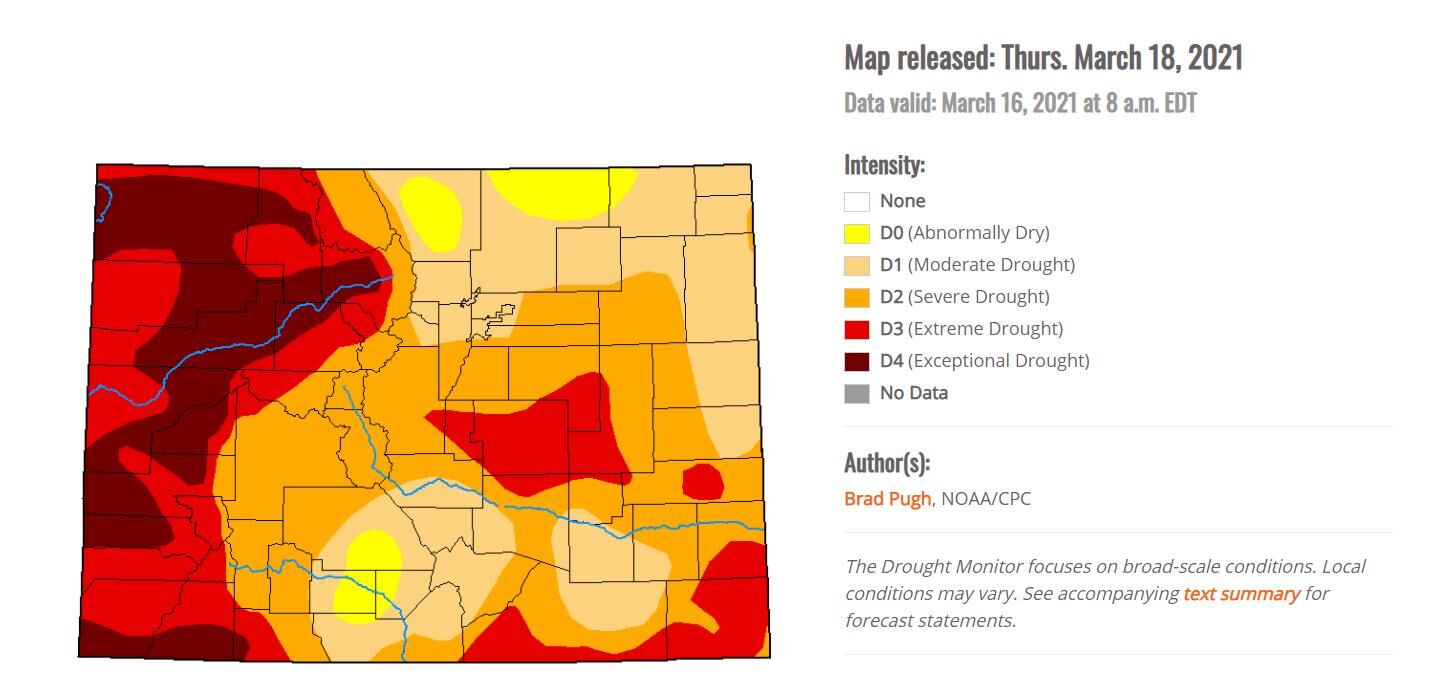 Last weekend’s Front Range snowstorm did little to stem the extreme drought conditions. As of Thursday, the entire state is in drought, with 15% of the state in exceptional drought, the worst level.