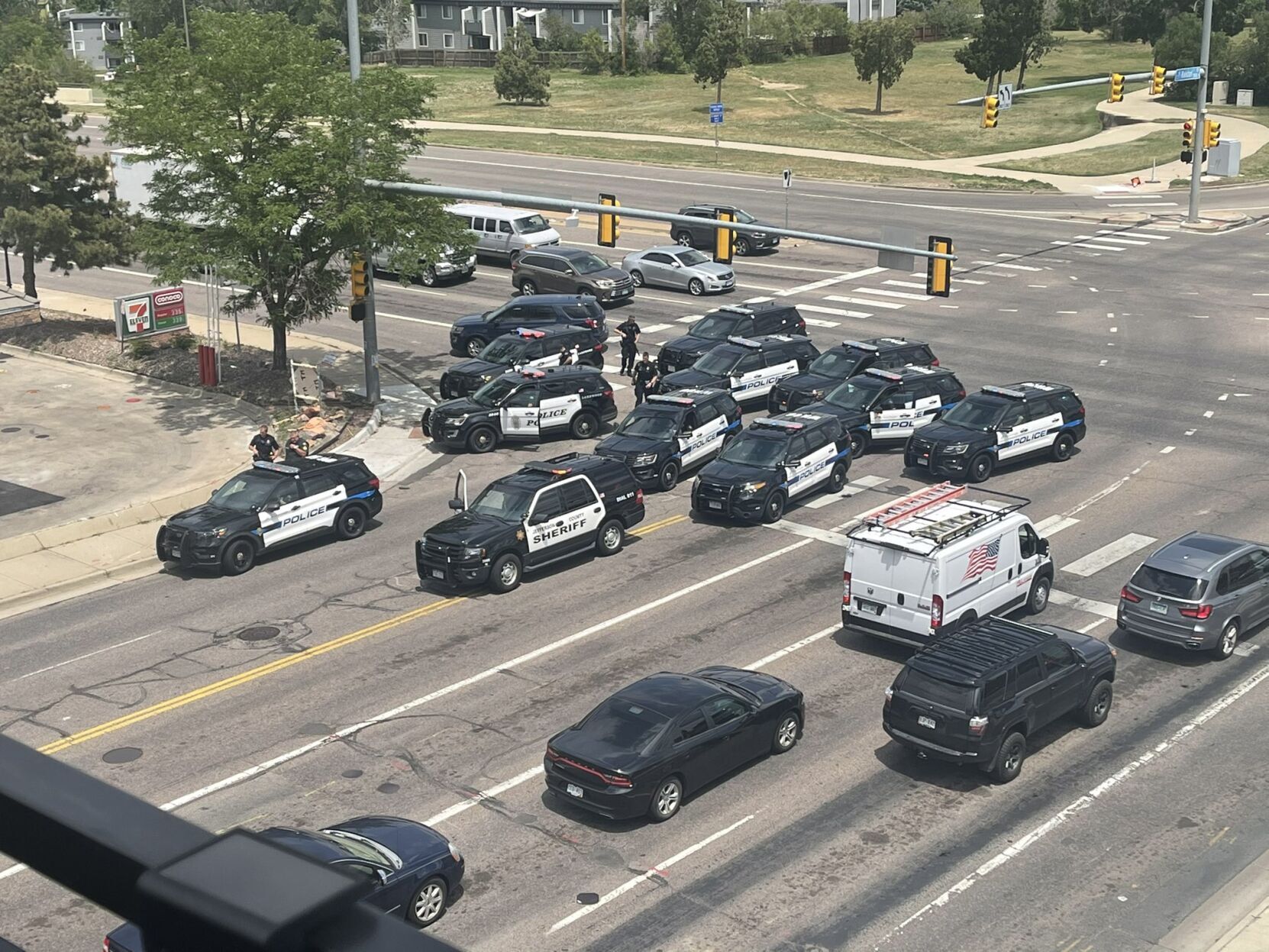 Brady said the incident began at 1:15 p.m. when officers responded to the Olde Town Arvada Square, near the library, on reports of a “suspicious incident.” Around 15 minutes later, the department received multiple 911 calls reporting that an officer had been shot.