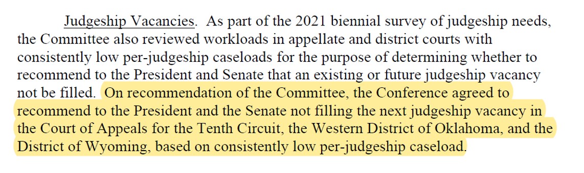 ? Marin K. Levy of Duke University School of Law observed that the 10th Circuit recommendation existed in 2019 and 2017 as well. In that time, the Trump Administration filled two vacancies on the court. “I do think they are trying to convey to Congress where they have real needs and where they don’t,” she added. “It might raise some eyebrows if they were only ever emphasizing their needs.”