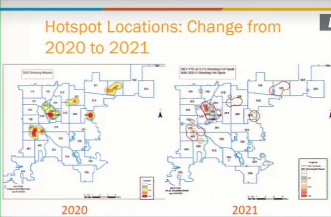 The police department has said that in 2020, 49% of shootings and 26% of homicides happened in five “hot spots” they identified centered on intersections across Denver, even though the areas made up only 1.56% of Denver’s land mass, excluding DIA.