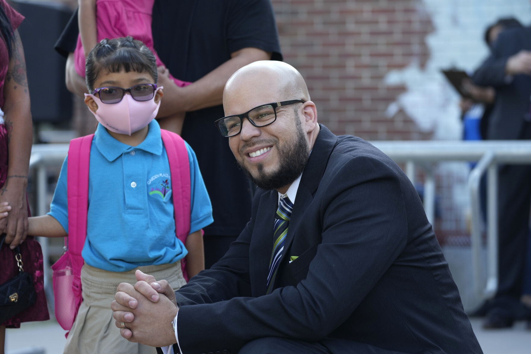 A DJ on the blacktop, dancing at about 50% enthusiasm in the Garden Place’s shade, played “Cha-Cha Slide.” Then he threw on “Teach Me How To Dougie,” a dance-explaining rap song. Perhaps sensing it wasn’t the right tone for the first day of elementary school, the DJ took it off within a minute.