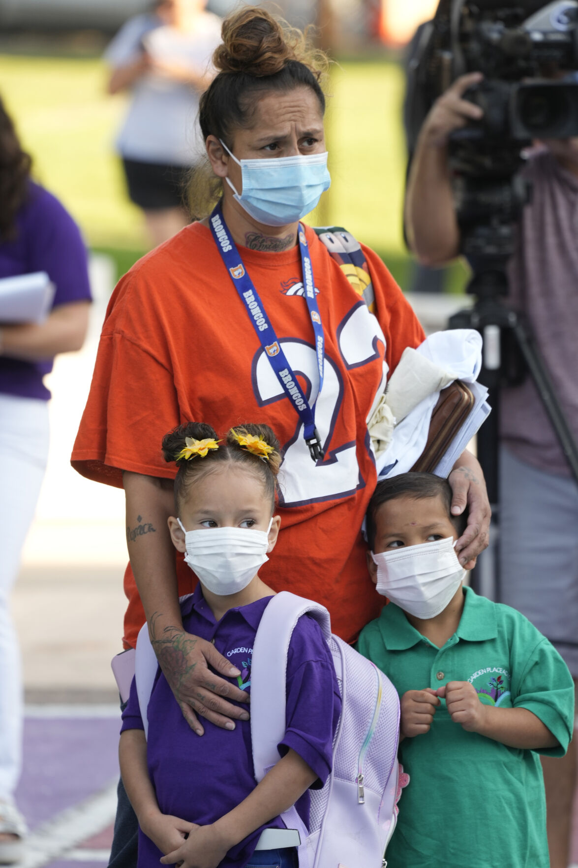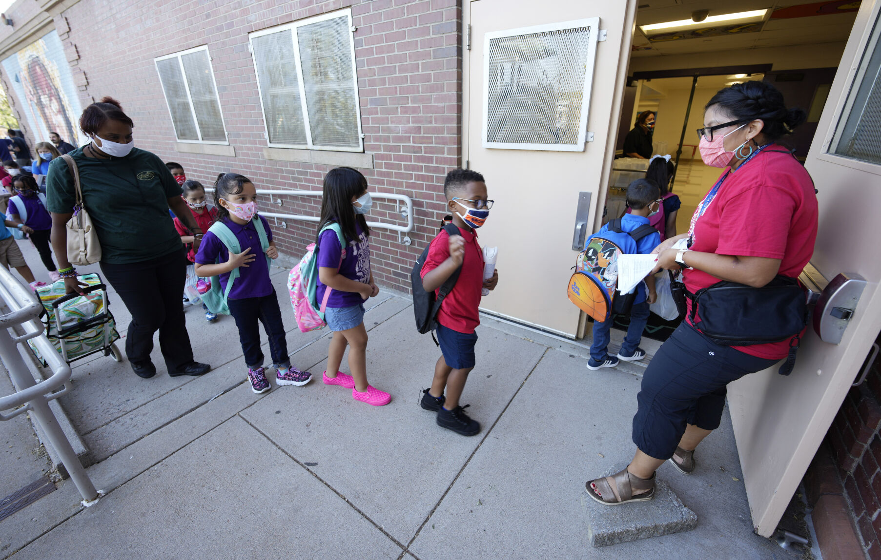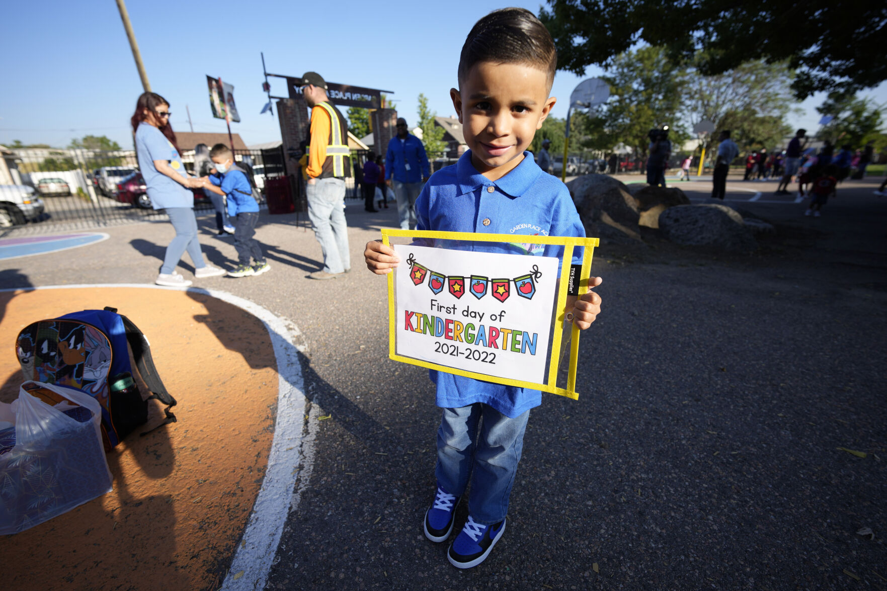 Eight-year-old Jason Melendez, center, carries boxes of facial tissues and a bag of other cleaning supplies as he joins classmates in heading in for the first day of in-class learning since the start of the pandemic at Garden Place Elementary School Monday, Aug. 23, 2021, in north Denver. All students, visitors and staff are required to wear face coverings while in Denver Public Schools regardless of vaccination status with the start of the school year. (AP Photo/David Zalubowski)David ZalubowskiFive-year-old Penelope Arias, front, waits with her kindergarten teacher Camille Antolak for classmates to queue up for the first day of in-class learning since the start of the pandemic at Garden Place Elementary School Monday, Aug. 23, 2021, in north Denver. All students, visitors and staff are required to wear face coverings while in Denver Public Schools regardless of vaccination status with the start of the school year. (AP Photo/David Zalubowski)David ZalubowskiFive-year-old Vincent Andrade holds up a sign for a photograph to mark his first day in kindergarten before the first day of in-class learning since the start of the pandemic at Garden Place Elementary School Monday, Aug. 23, 2021, in north Denver. All students, visitors and staff are required to wear face coverings while in Denver Public Schools regardless of vaccination status with the start of the school year.(AP Photo/David Zalubowski)David ZalubowskiSix-year-old Juan Carlos Ruiz-Dirzo wears a face covering as he waits to enter the building for the first day of in-class learning since the start of the pandemic at Garden Place Elementary School Monday, Aug. 23, 2021, in north Denver. All students, visitors and staff are required to wear face coverings while in Denver Public Schools regardless of vaccination status with the start of the school year. (AP Photo/David Zalubowski)David ZalubowskiAlex Marrero, superintendent of Denver Public Schools, back center, greets students for the first day of in-class learning since the start of the pandemic at Garden Place Elementary School Monday, Aug. 23, 2021, in north Denver. All students, visitors and staff are required to wear face coverings while in Denver Public Schools regardless of vaccination status with the start of the school year. (AP Photo/David Zalubowski)David ZalubowskiStudents in masks queue up to enter the building for the first day of in-class learning since the start of the pandemic at Garden Place Elementary School Monday, Aug. 23, 2021, in north Denver. All students, visitors and staff are required to wear face coverings while in Denver Public Schools regardless of vaccination status with the start of the school year.(AP Photo/David Zalubowski)David ZalubowskiStudents head into the building for the first day of in-class learning since the start of the pandemic at Garden Place Elementary School Monday, Aug. 23, 2021, in north Denver. All students, visitors and staff are required to wear face coverings while in Denver Public Schools regardless of vaccination status with the start of the school year.(AP Photo/David Zalubowski)David ZalubowskiAnalyn Tapia, left, and Dezirae Espinoza hold their supplies as they wait to enter the building for the first day of in-class learning since the start of the pandemic at Garden Place Elementary School Monday, Aug. 23, 2021, in north Denver. All students, visitors and staff are required to wear face coverings while in Denver Public Schools regardless of vaccination status with the start of the school year. (AP Photo/David Zalubowski)David ZalubowskiAlex Marrero, front, superintendent of Denver Public Schools, greets students for the first day of in-class learning since the start of the pandemic at Garden Place Elementary School Monday, Aug. 23, 2021, in north Denver. All students, visitors and staff are required to wear face coverings while in Denver Public Schools regardless of vaccination status with the start of the school year. (AP Photo/David Zalubowski)David ZalubowskiDezirae Espinoza wears a face mask while cradling a tube of cleaning wipes as she waits to enter the building for the first day of in-class learning since the start of the pandemic at Garden Place Elementary School Monday, Aug. 23, 2021, in north Denver. All students, visitors and staff are required to wear face coverings while in Denver Public Schools regardless of vaccination status with the start of the school year. (AP Photo/David Zalubowski)David ZalubowskiLouise Cisneros, back, joins her daughter, Christine, front left, and grandson Daniel Ramirez in waiting to enter for the first day of in-class learning since the start of the pandemic at Garden Place Elementary School Monday, Aug. 23, 2021, in north Denver. All students, visitors and staff are required to wear face coverings while in Denver Public Schools regardless of vaccination status with the start of the school year.(AP Photo/David Zalubowski)David Zalubowski