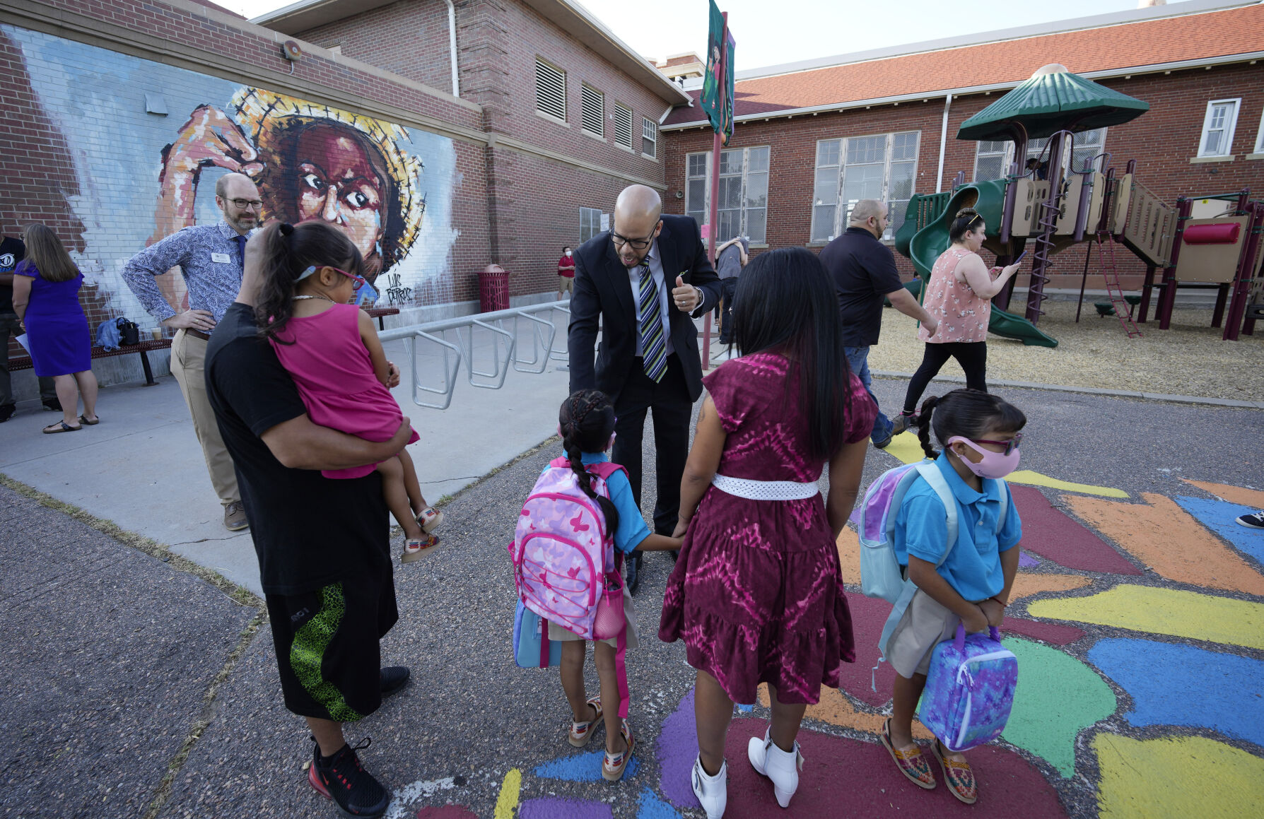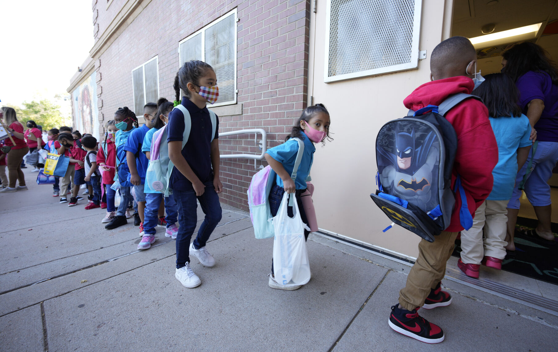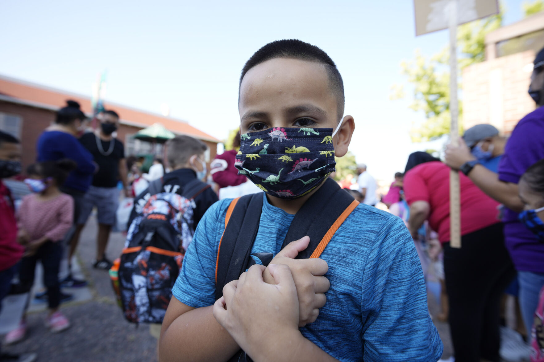 Eight-year-old Jason Melendez, center, carries boxes of facial tissues and a bag of other cleaning supplies as he joins classmates in heading in for the first day of in-class learning since the start of the pandemic at Garden Place Elementary School Monday, Aug. 23, 2021, in north Denver. All students, visitors and staff are required to wear face coverings while in Denver Public Schools regardless of vaccination status with the start of the school year. (AP Photo/David Zalubowski)David ZalubowskiFive-year-old Penelope Arias, front, waits with her kindergarten teacher Camille Antolak for classmates to queue up for the first day of in-class learning since the start of the pandemic at Garden Place Elementary School Monday, Aug. 23, 2021, in north Denver. All students, visitors and staff are required to wear face coverings while in Denver Public Schools regardless of vaccination status with the start of the school year. (AP Photo/David Zalubowski)David ZalubowskiFive-year-old Vincent Andrade holds up a sign for a photograph to mark his first day in kindergarten before the first day of in-class learning since the start of the pandemic at Garden Place Elementary School Monday, Aug. 23, 2021, in north Denver. All students, visitors and staff are required to wear face coverings while in Denver Public Schools regardless of vaccination status with the start of the school year.(AP Photo/David Zalubowski)David ZalubowskiSix-year-old Juan Carlos Ruiz-Dirzo wears a face covering as he waits to enter the building for the first day of in-class learning since the start of the pandemic at Garden Place Elementary School Monday, Aug. 23, 2021, in north Denver. All students, visitors and staff are required to wear face coverings while in Denver Public Schools regardless of vaccination status with the start of the school year. (AP Photo/David Zalubowski)David ZalubowskiAlex Marrero, superintendent of Denver Public Schools, back center, greets students for the first day of in-class learning since the start of the pandemic at Garden Place Elementary School Monday, Aug. 23, 2021, in north Denver. All students, visitors and staff are required to wear face coverings while in Denver Public Schools regardless of vaccination status with the start of the school year. (AP Photo/David Zalubowski)David ZalubowskiStudents in masks queue up to enter the building for the first day of in-class learning since the start of the pandemic at Garden Place Elementary School Monday, Aug. 23, 2021, in north Denver. All students, visitors and staff are required to wear face coverings while in Denver Public Schools regardless of vaccination status with the start of the school year.(AP Photo/David Zalubowski)David ZalubowskiStudents head into the building for the first day of in-class learning since the start of the pandemic at Garden Place Elementary School Monday, Aug. 23, 2021, in north Denver. All students, visitors and staff are required to wear face coverings while in Denver Public Schools regardless of vaccination status with the start of the school year.(AP Photo/David Zalubowski)David ZalubowskiAnalyn Tapia, left, and Dezirae Espinoza hold their supplies as they wait to enter the building for the first day of in-class learning since the start of the pandemic at Garden Place Elementary School Monday, Aug. 23, 2021, in north Denver. All students, visitors and staff are required to wear face coverings while in Denver Public Schools regardless of vaccination status with the start of the school year. (AP Photo/David Zalubowski)David ZalubowskiAlex Marrero, front, superintendent of Denver Public Schools, greets students for the first day of in-class learning since the start of the pandemic at Garden Place Elementary School Monday, Aug. 23, 2021, in north Denver. All students, visitors and staff are required to wear face coverings while in Denver Public Schools regardless of vaccination status with the start of the school year. (AP Photo/David Zalubowski)David ZalubowskiDezirae Espinoza wears a face mask while cradling a tube of cleaning wipes as she waits to enter the building for the first day of in-class learning since the start of the pandemic at Garden Place Elementary School Monday, Aug. 23, 2021, in north Denver. All students, visitors and staff are required to wear face coverings while in Denver Public Schools regardless of vaccination status with the start of the school year. (AP Photo/David Zalubowski)David ZalubowskiLouise Cisneros, back, joins her daughter, Christine, front left, and grandson Daniel Ramirez in waiting to enter for the first day of in-class learning since the start of the pandemic at Garden Place Elementary School Monday, Aug. 23, 2021, in north Denver. All students, visitors and staff are required to wear face coverings while in Denver Public Schools regardless of vaccination status with the start of the school year.(AP Photo/David Zalubowski)David Zalubowski