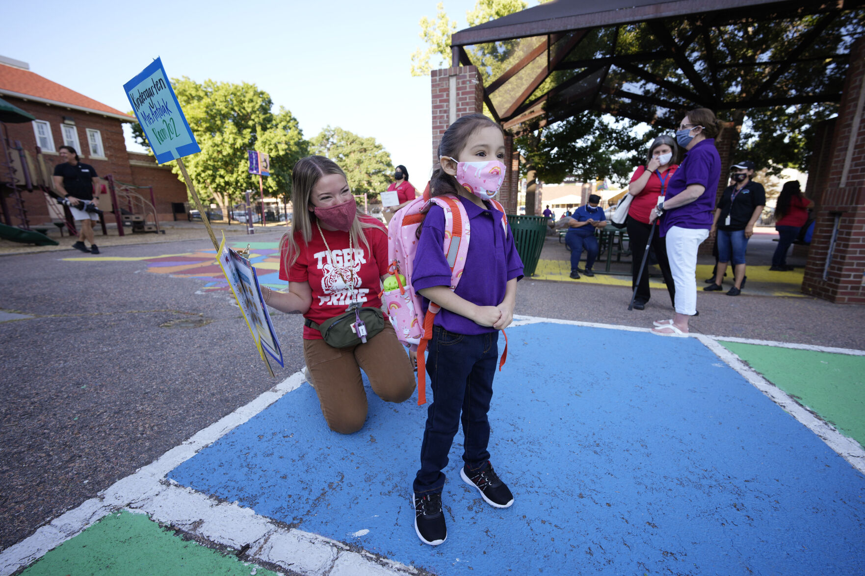 Though they marked another school year remade by COVID-19, the first-day scenes were remarkably familiar. Parents looked on and took photos. Teachers shouted instructions and checked names on clipboards. Kids clung to parents or ran to their classmates at the first chance. Teachers wielding poles with signs announcing their names and grade levels marched into the building with their charges in tow. Ms. Lopez’s fifth-grade sign was emblazoned in graffiti font.