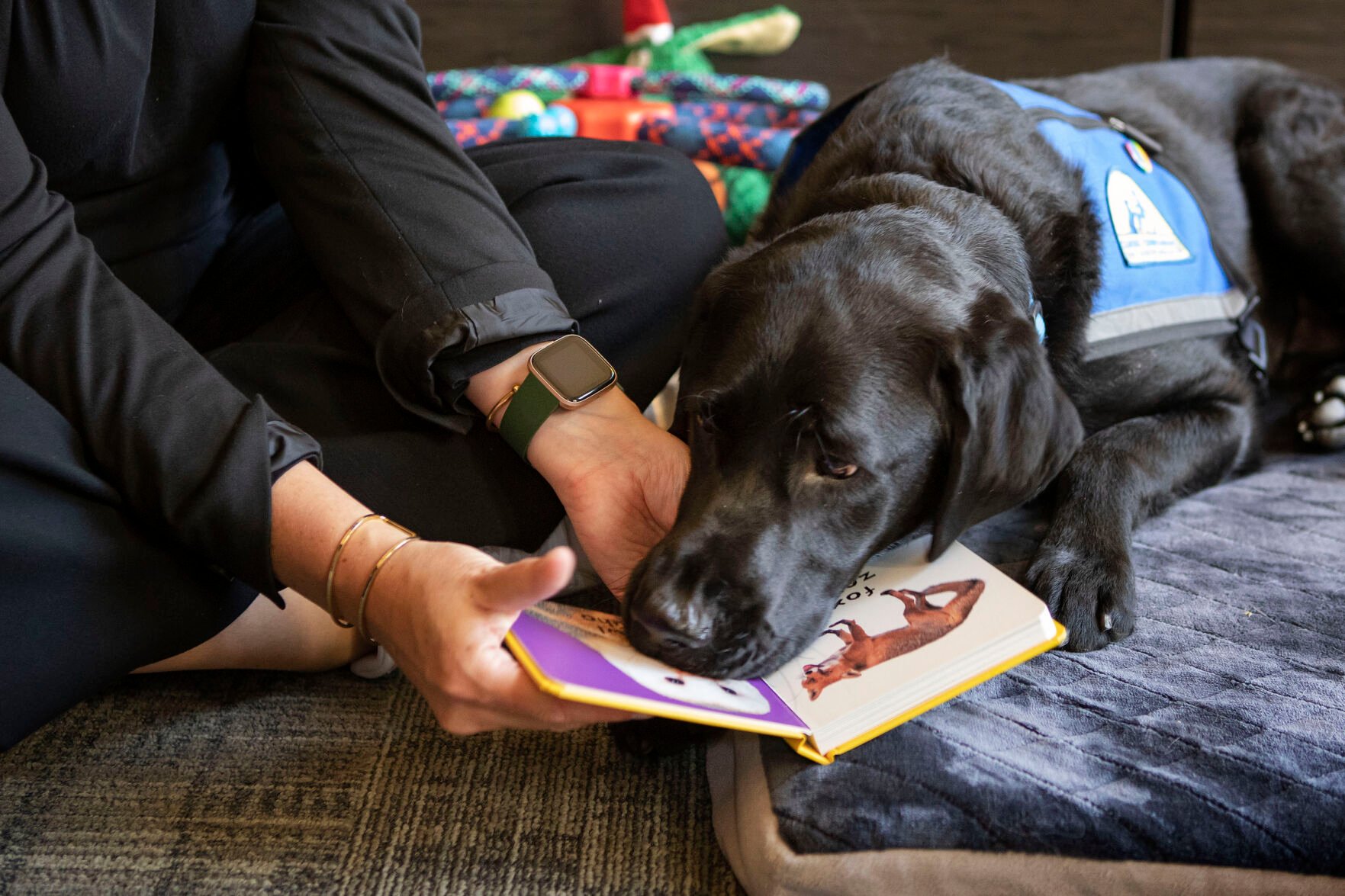 When called on, Buck uses his pitch-black nose to turn the page of a picture book and grips a box of tissues in his teeth to bring to someone who might need one.