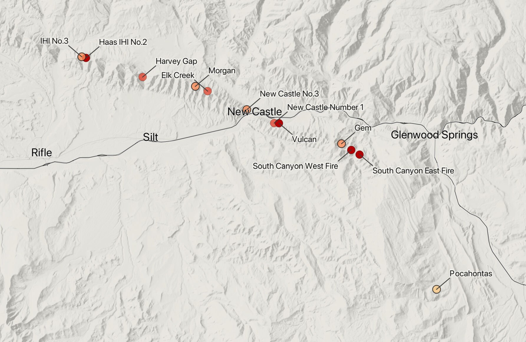 The area west of Glenwood Springs is relatively dense with underground coal mine fires, especially around the small town of New Castle, 13 miles west of Glenwood Springs, where three underground coal mine fires burn on the periphery of a 2-mile area that’s home to almost 6,000 residents. The state deems one of the fires to be of low risk, one medium risk and one high risk.