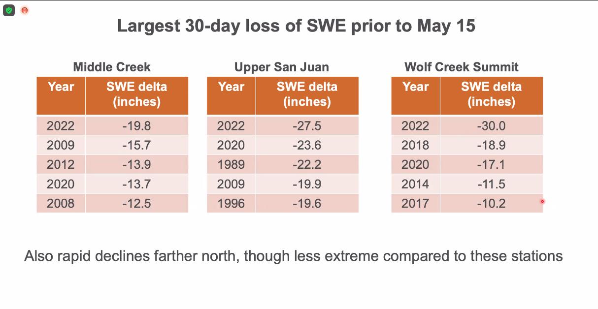 The news got worse for south central Colorado, including the San Luis Valley and the Rio Grande River basin, where snowmelt peaked on May 8. That’s a month early, the experts noted.