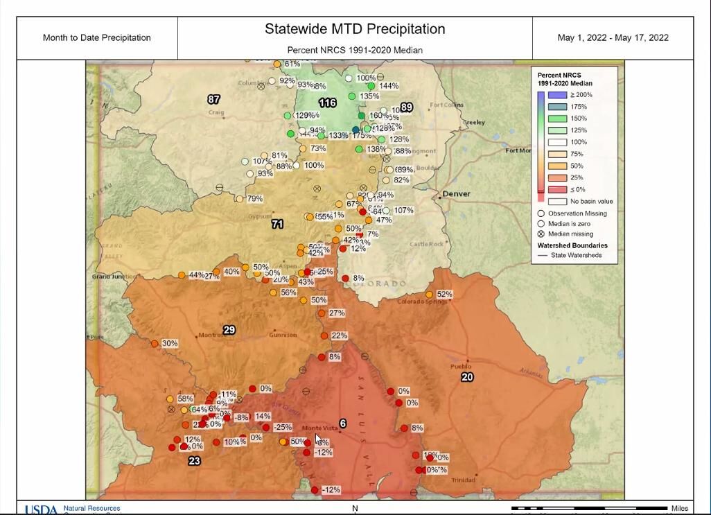 The bottom line is that wind, combined with a lot of sun, little humidity and no rain for most of the state in April meant the soil, just as planting season is getting underway, was too dry. May’s warmer than average temperatures have compounded the problem – Schumacher said on average the state has been about six degrees warmer than normal. Most of the state is reporting below average rainfall since early April, with the worst conditions in southeastern Colorado, Schumacher reported.