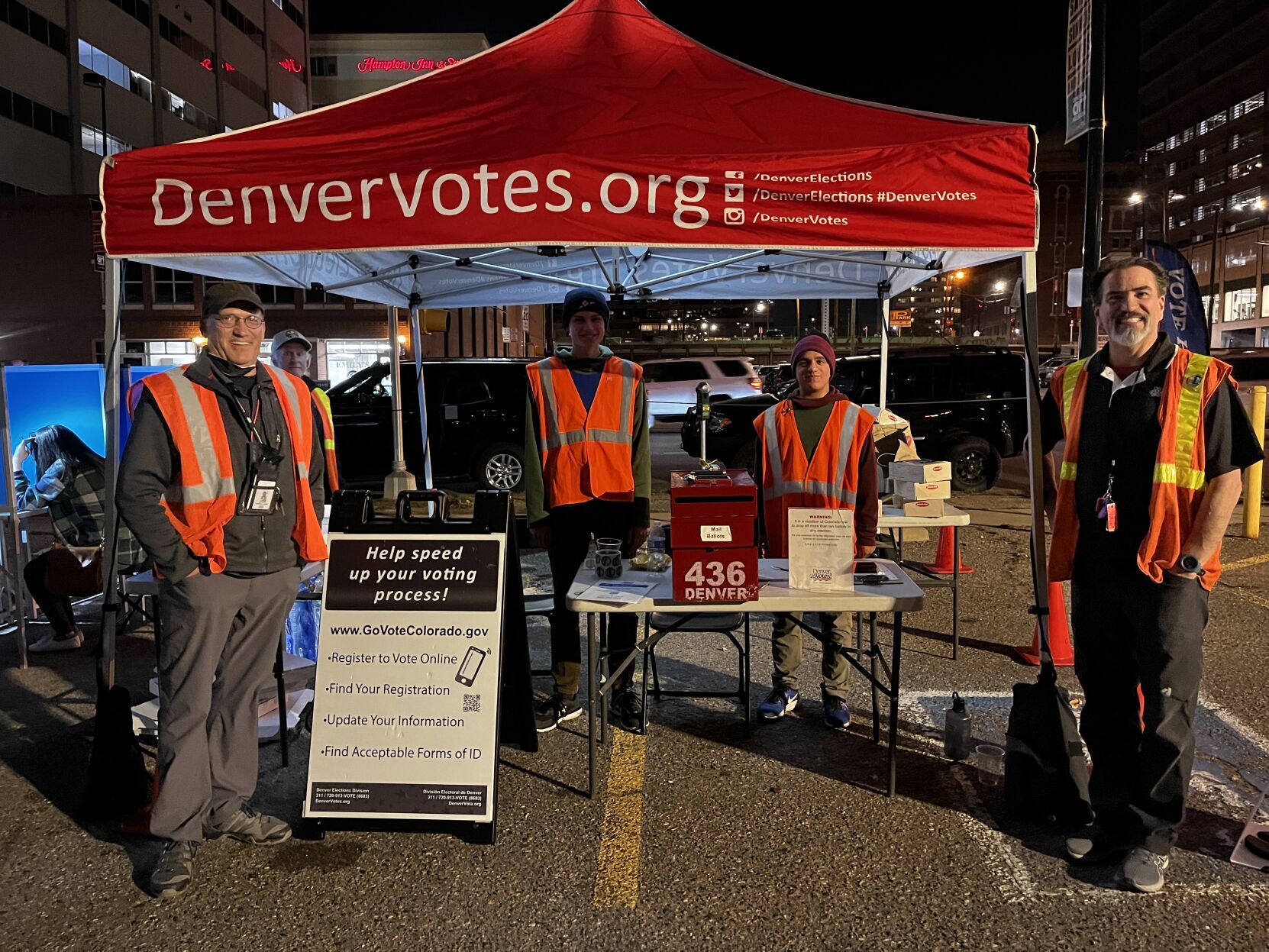 Poll workers smile as Denverites drop off their ballots on election night Tuesday, Nov. 8, 2022.