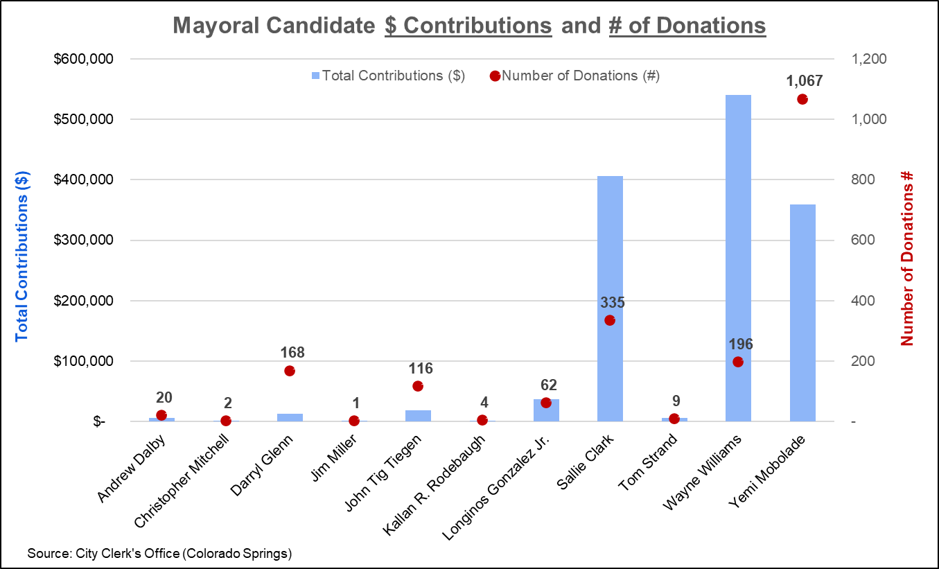 The top three mayoral candidates have also significantly outraised competitors with help from business interests. Williams is in first place with about $540,000, followed by former City Councilwoman and El Paso County Commissioner Sallie Clark who has raised about $400,000. Businessman Yemi Mobolade has raised about $360,000. His donations on average have been significantly smaller. Businessman Andrew Dalby is also among the top spenders in the race after giving himself a $375,000 loan, according to city campaign finance disclosures.