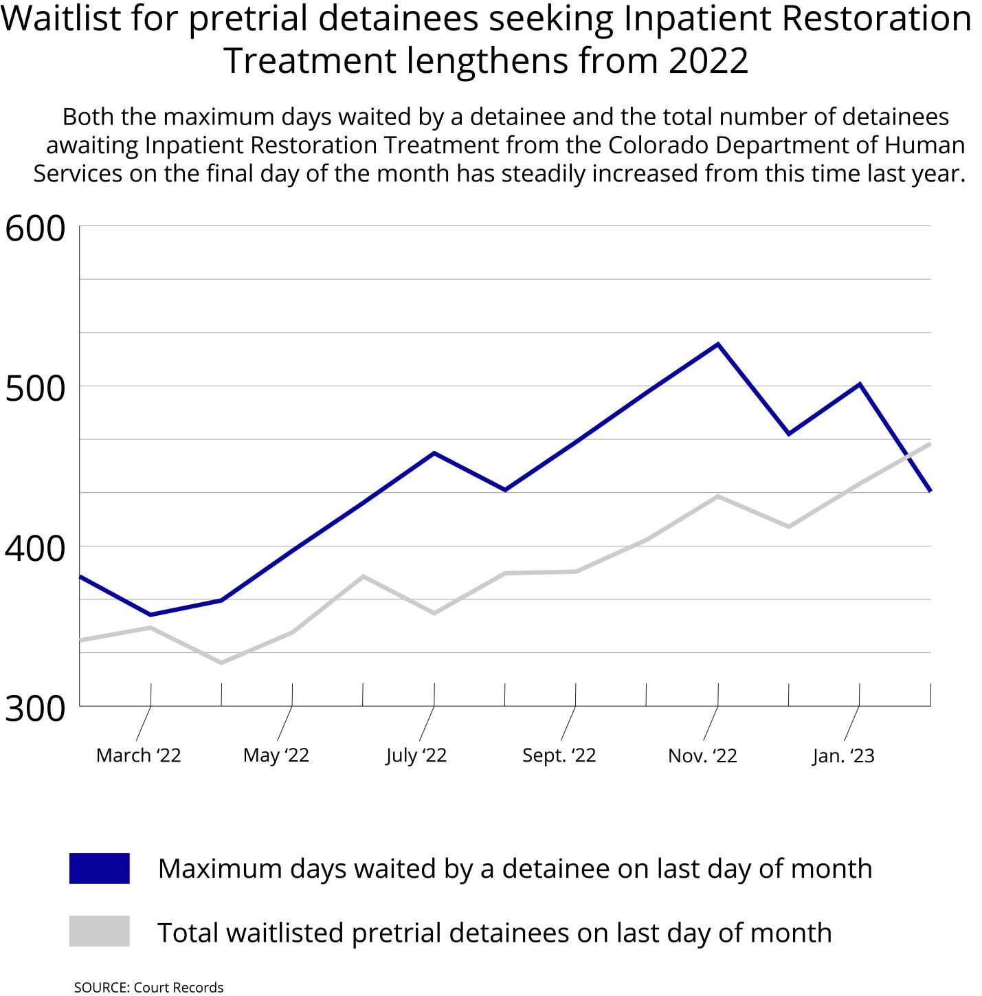 Court records show that at the end of February one individual had been waiting for 434 days for such court-ordered services. Among those with issues so acute that the lack of treatment posed a threat to themselves or others, the average wait for restoration services was 76 days that month. The state pledged three years ago that those with such acute problems deemed incompetent for trial would receive restoration treatment within a week.