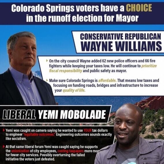 A new digital ad from Colorado Springs mayoral candidate Wayne Williams’ campaign hit social media this week, presenting him as the conservative Republican candidate Colorado Springs should choose over his “liberal” opponent in the nonpartisan race, Yemi Mobolade.