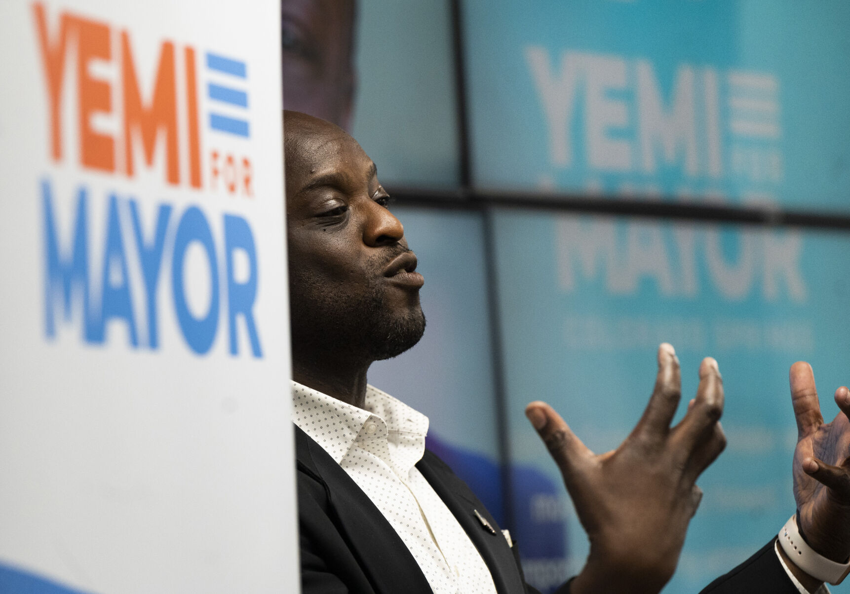 “I will look at the issues in our city with fresh eyes, without being beholden to special interests. Actually, I do have a special interest. It’s you,” Mobolade gestured at the crowd. “… I am so humbled to be an agent of good disruption. We will move the city forward in a way that is … pragmatic.”
