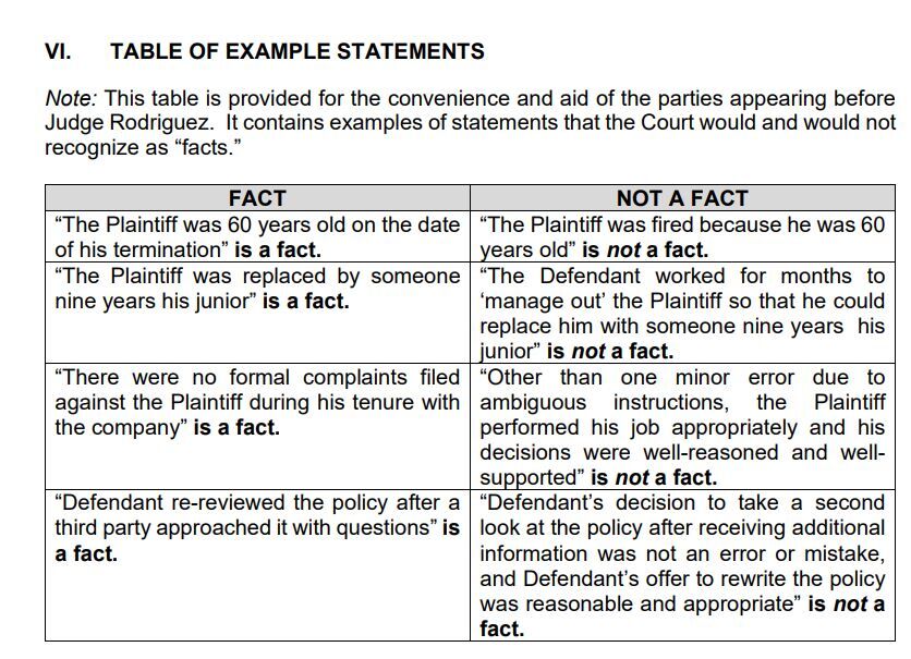 In her courtroom rules, Rodriguez requires lawyers, if they want to file a motion for summary judgment, to confer with the other side and submit a chart listing the facts of the case and whether those are in dispute. Originally, Rodriguez said she made the charts herself in order to decide whether it was truly necessary for a jury to sort out the facts themselves in trial.