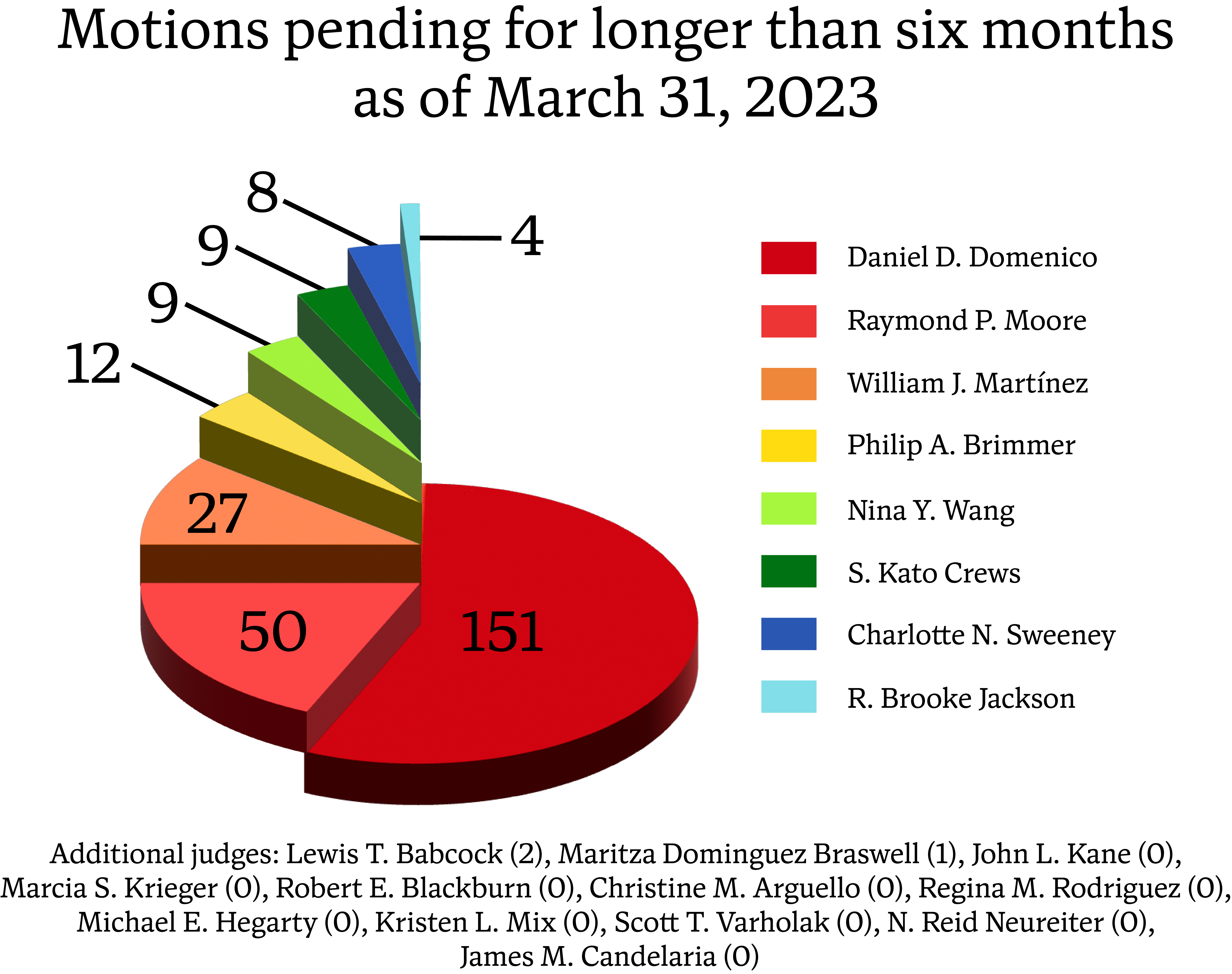 Many of the motions she inherited were on the “six-month list,” a product of the Civil Justice Reform Act of 1990. The law requires public disclosure of all motions that have been pending before federal trial judges for longer than six months. Colorado Politics recently reported that some judges in Colorado – specifically, those who are more senior – have persistently high backlogs in their civil caseloads.