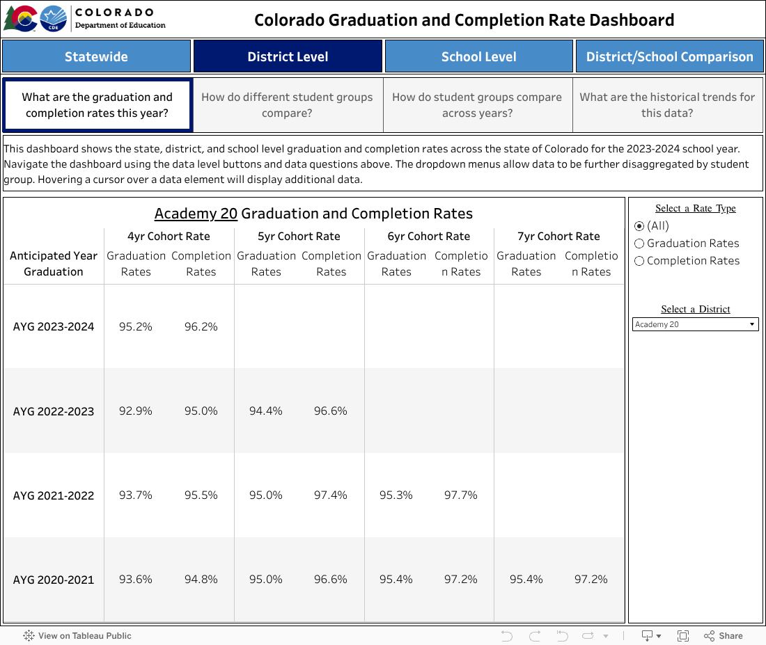 The department provides an interactive web dashboard to explore graduation and completion rates on a statewide, district and school level, available here.