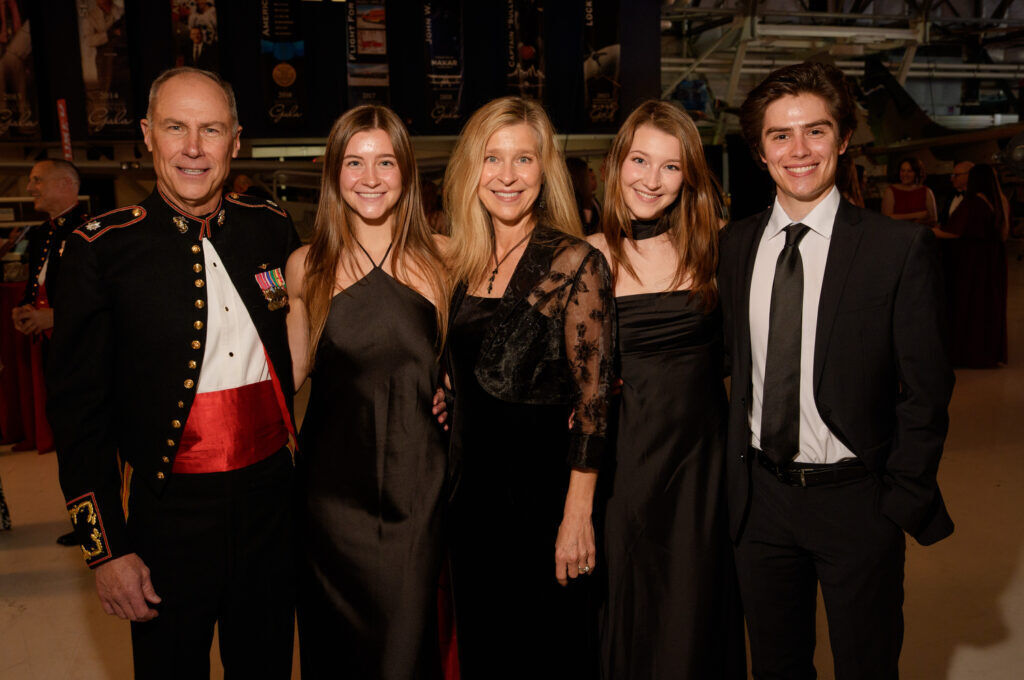 Photo StevePeterson.photoLt. Col. Mike Hile, USMC (Ret.), left, and his family: daughter Kendal, wife Cornelia, daughter Nicole Hartmann, and her husband, Brian Hartmann. The United States Marine Corps 250th Birthday Ball Celebration at the Wings Over the Rockies Air & Space Museum in Denver, Colorado, on Sunday, Nov. 9, 2025.