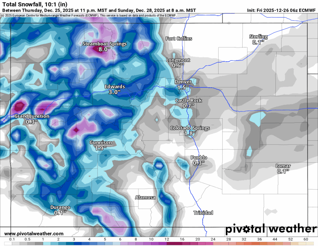 The European ECWMF model has snow falling through late Saturday night/overnight Sunday morning and some sizeable totals could be close to 20 inches when all is said and done on mountain tops around Steamboat, Powderhorn and Wolf Creek.