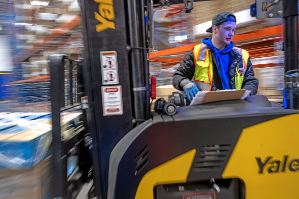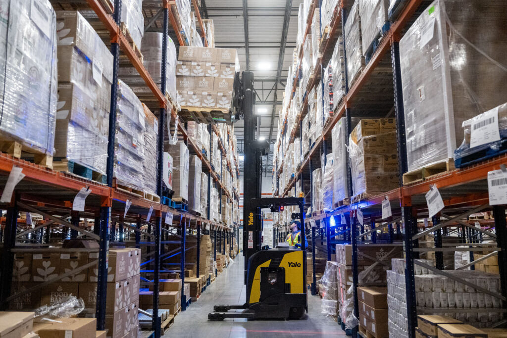 Shelves of food tower to the ceiling in Food Bank of the Rockies’ new distribution center, which now houses all of the hunger-relief organization’s operations.