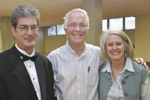Master of ceremonies Kip Cheroutes, Doug Linkhart and state Rep. Beth McCann, D-Denver, visit before the program gets under way at the HD 8 Democrats’ annual spaghetti dinner.Photo by Ernest Luning/The Colorado Statesman
