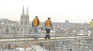 Atop the small upper dome of the State Capitol is a crystal globe currently surrounded with scaffolding and enclosed in a fire retardant scrim..