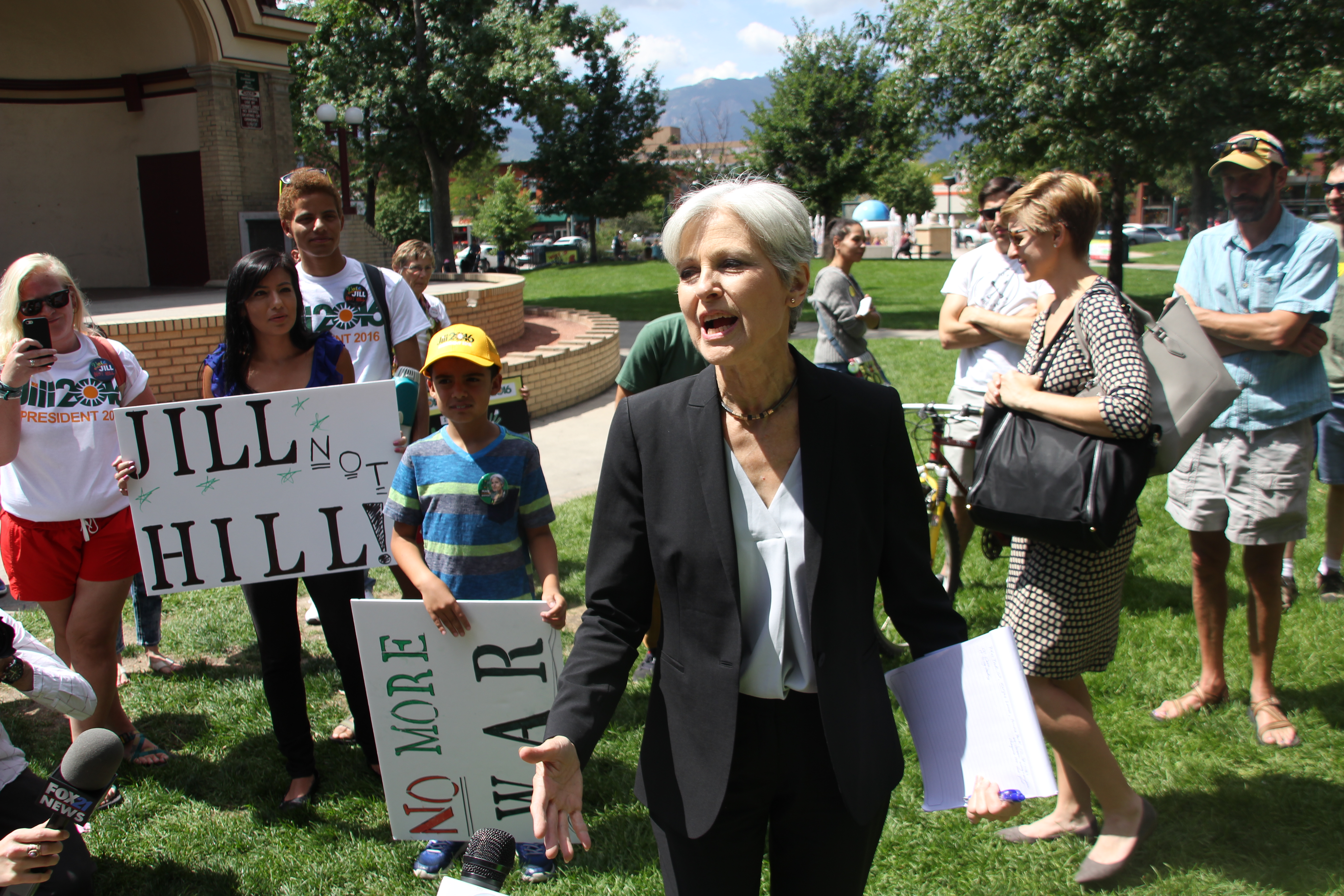 Stein, a physician from Massachusetts, rallied a modest group of supporters at Colorado Springs’ Acacia Park, before leading a march through downtown chanting political battle cries like “Jill not Hill,” on their way to the All Souls Unitarian Universalist Church where a larger group of more than 100 gathered.