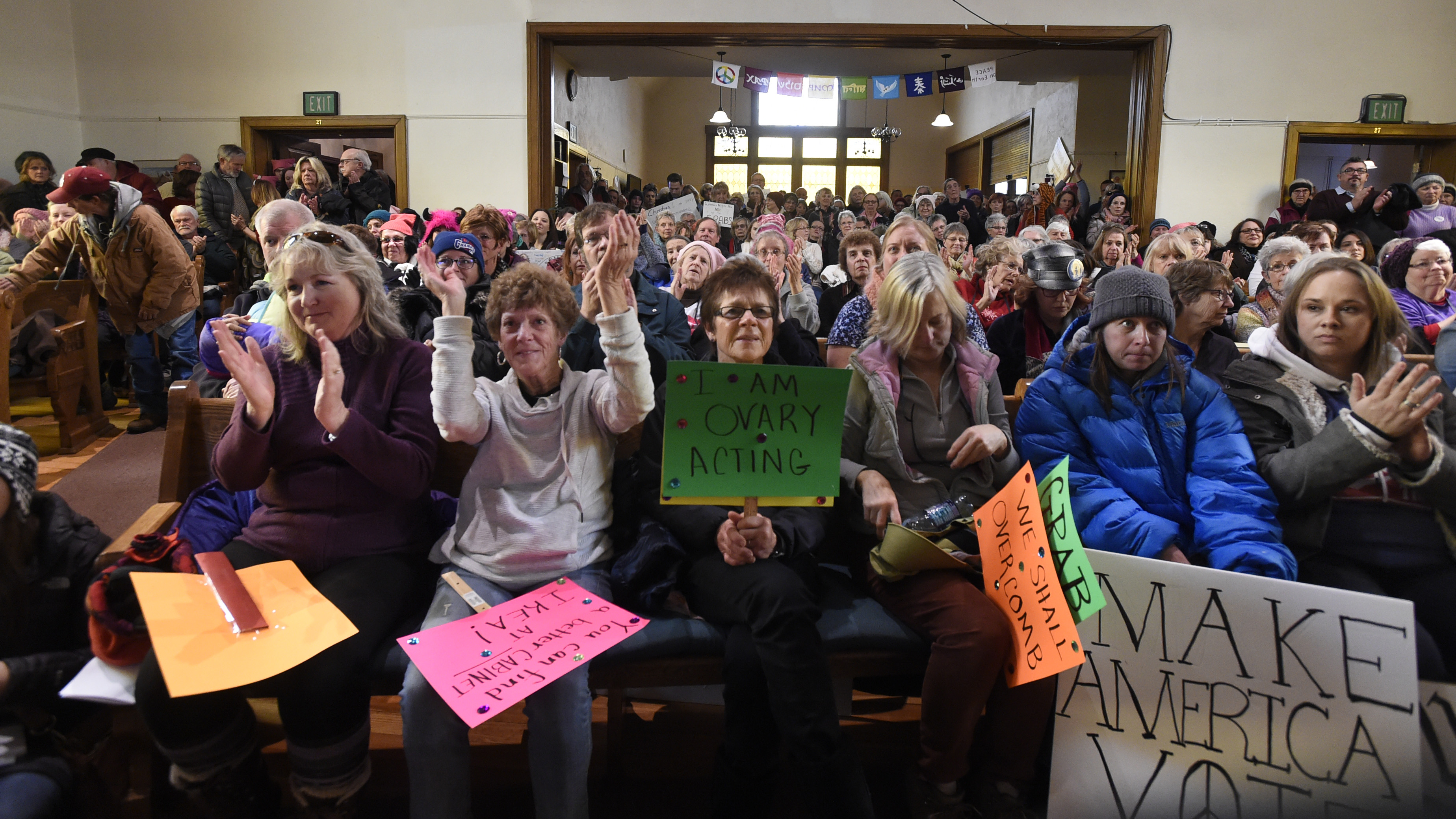 Organizers initially planned to gather at Acacia Park, but moved it indoors because of the predicted winter storm. Hundreds crowded into the church while hundreds more gathered outside to await the start of the march.