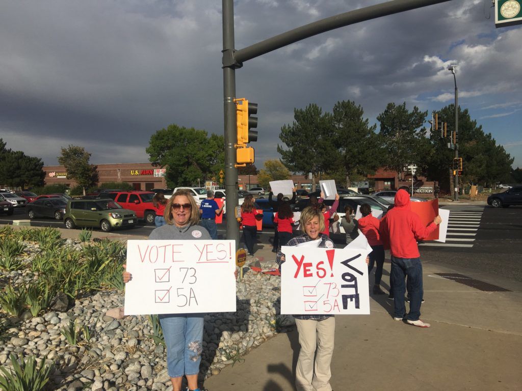 Waving “Yes on Amendment 73” signs, Denver teachers formed red-shirted clusters along Colfax Avenue Friday afternoon.