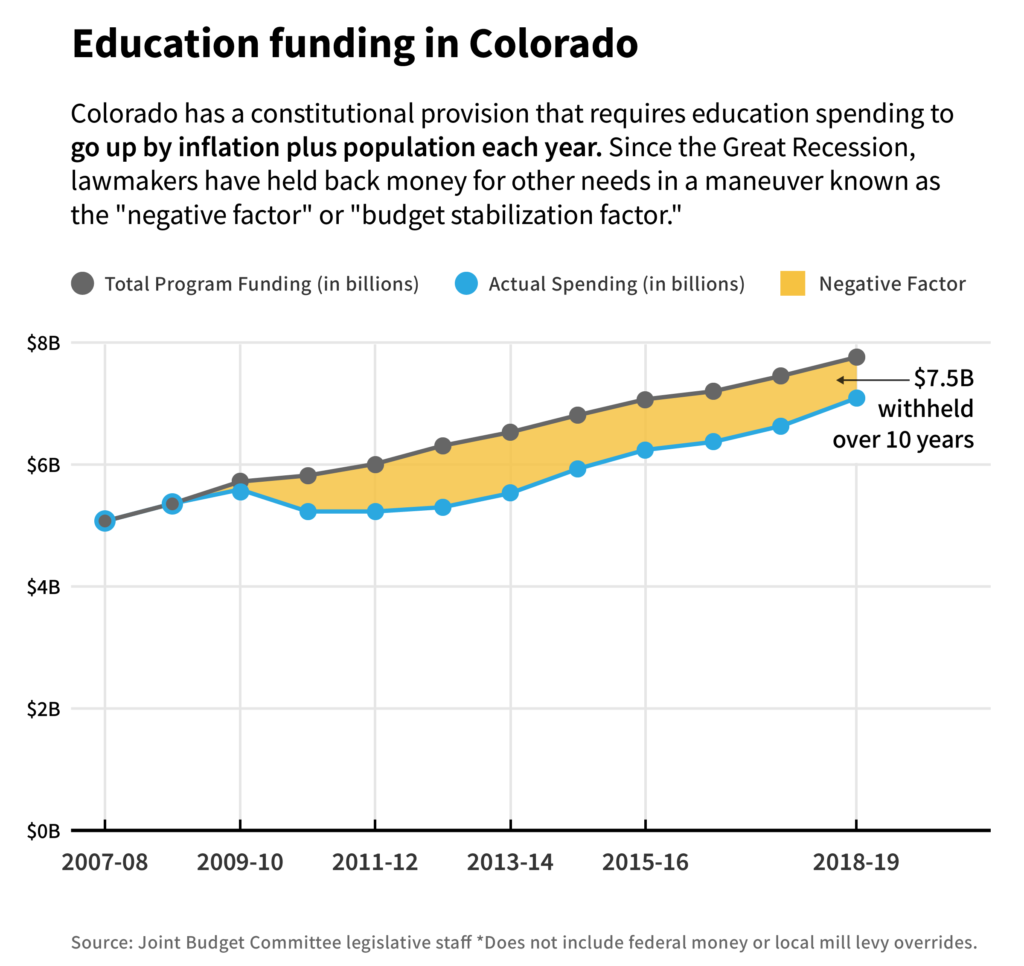 Back in 2000, after previous years of budget cuts, Colorado voters passed a constitutional amendment that requires school funding to increase by population plus inflation. But starting with the Great Recession, Colorado lawmakers have not allocated all the money required by that amendment. Over the past 10 years, Colorado schools have missed out on $7.5 billion the law requires them to receive. The courts have upheld this budget maneuver. Money from Amendment 73 could not be reallocated during the next downturn, protecting schools but potentially creating other budget problems for the state.
