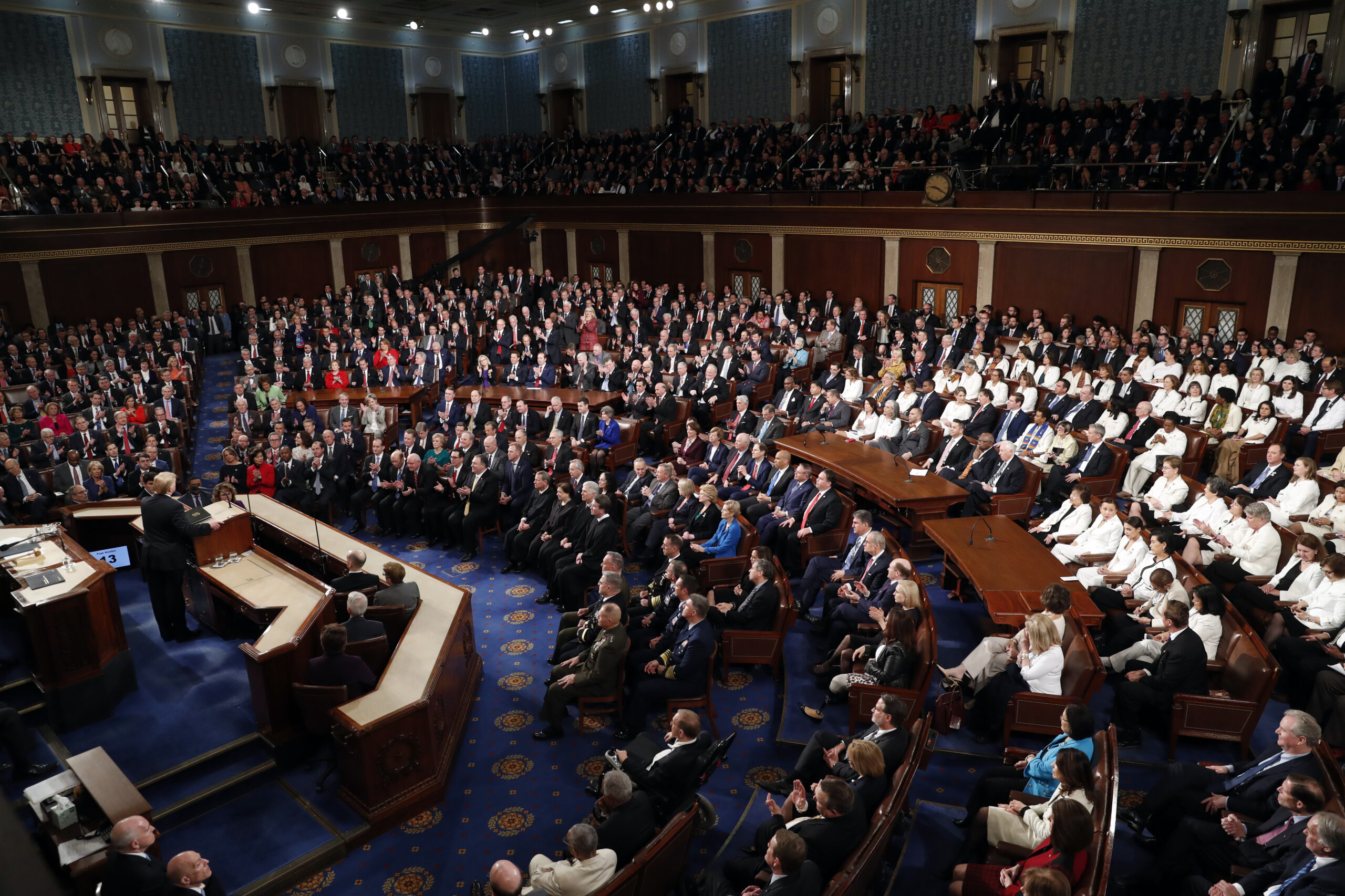 Trump accepted no blame for his role in cultivating the rancorous atmosphere in the nation’s capital, and he didn’t outline a clear path for collaborating with Democrats who are eager to block his agenda. Their opposition was on vivid display as Democratic congresswomen in the audience formed a sea of white in a nod to early 20th-century suffragettes.