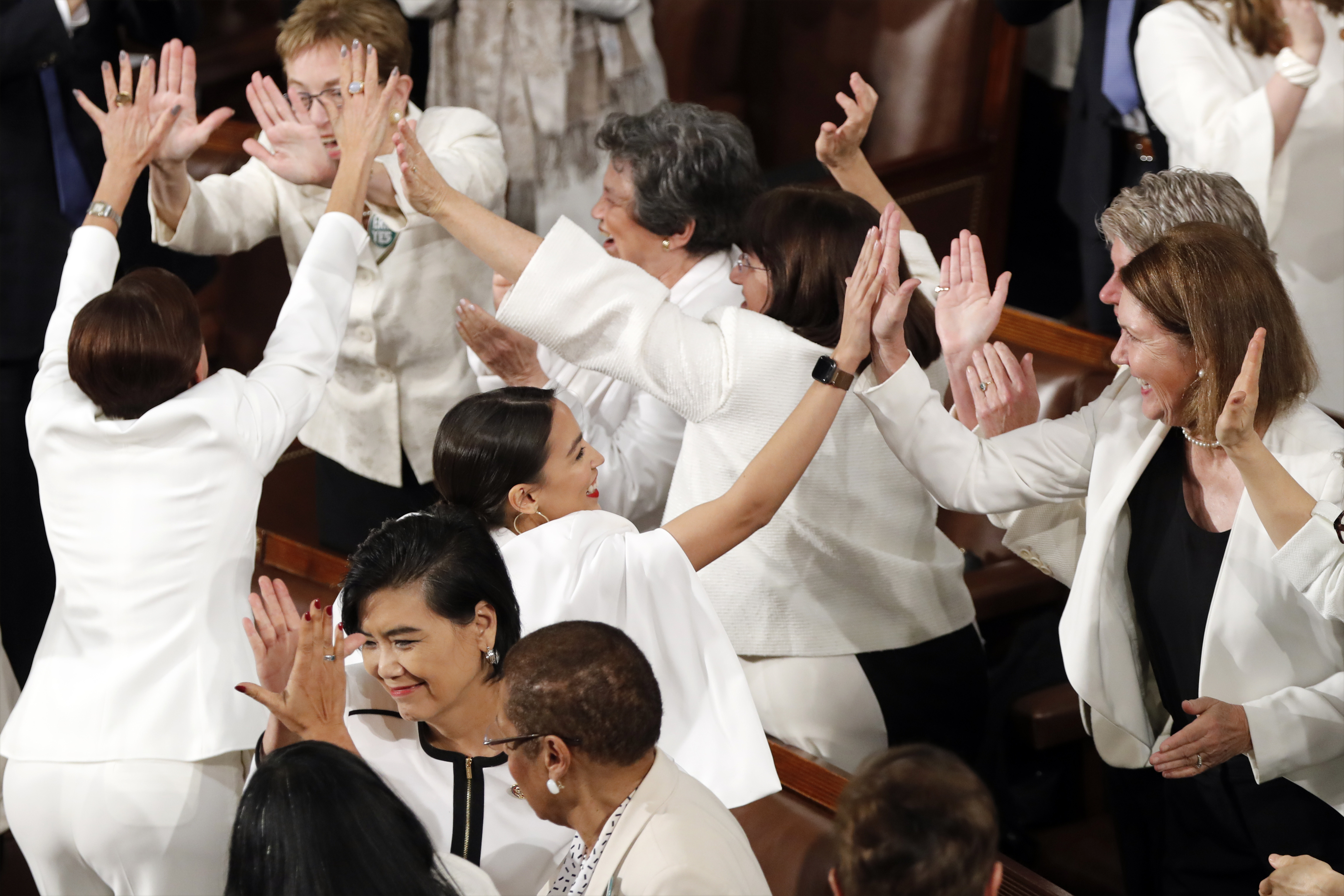 At points, Democrats seemed to outpace Republican members in enthusiasm. Sen. Kyrsten Sinema, D-Ariz, who wore hot pink rather than the white many of the women did to celebrate women’s suffrage, repeatedly stood to applaud Trump’s optimistic and vague promotions of “greatness” – the speech’s theme. Rep. Ted Lieu, D-Calif., a frequent critic of Trump on Twitter and TV, also applauded routinely, as did moderate Democratic Sen. Joe Manchin of West Virginia.