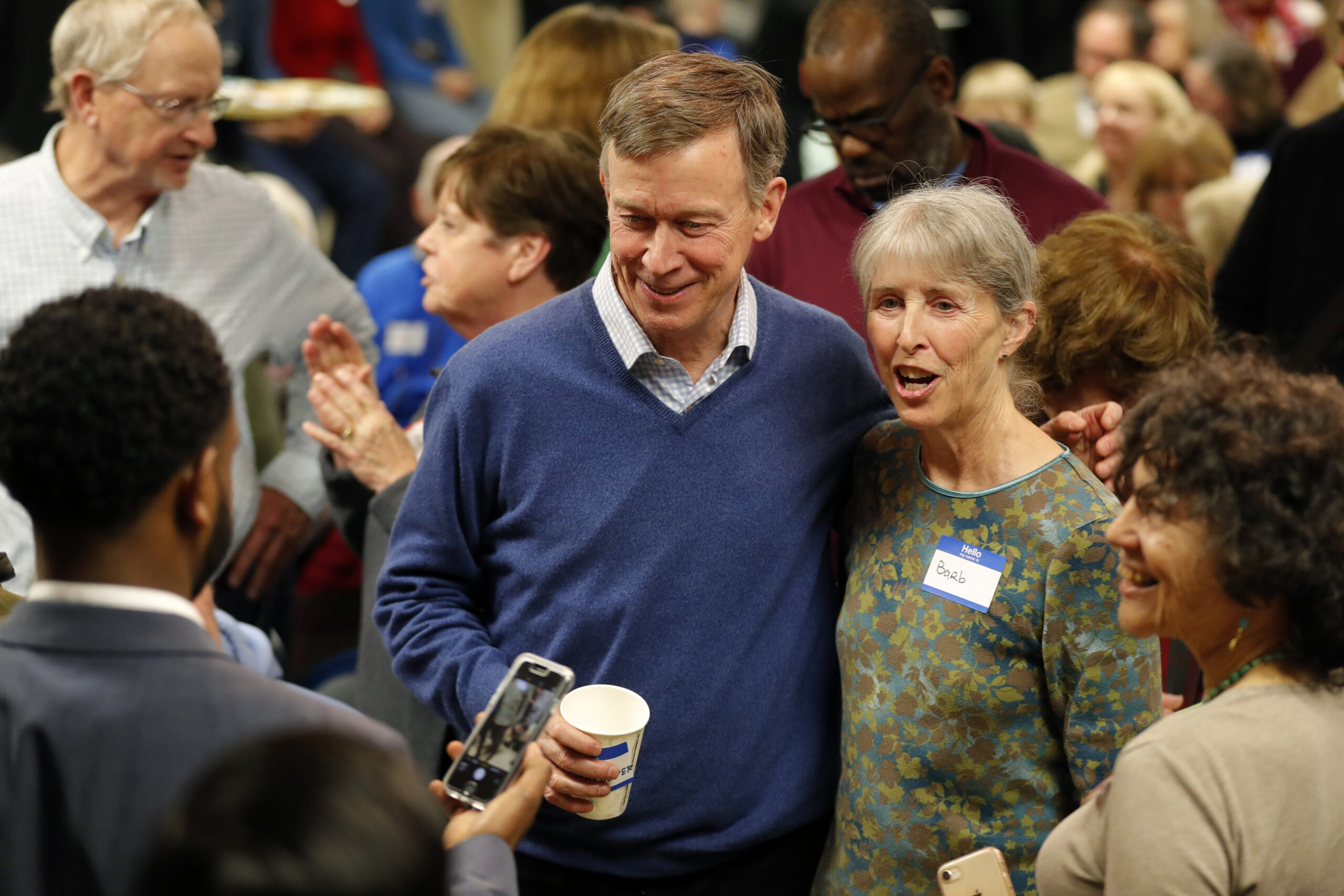 Nearby, Chelsea Chism-Vargas of Des Moines leaned in for a selfie with Hickenlooper and asked the former governor of Colorado his position on abortion rights.