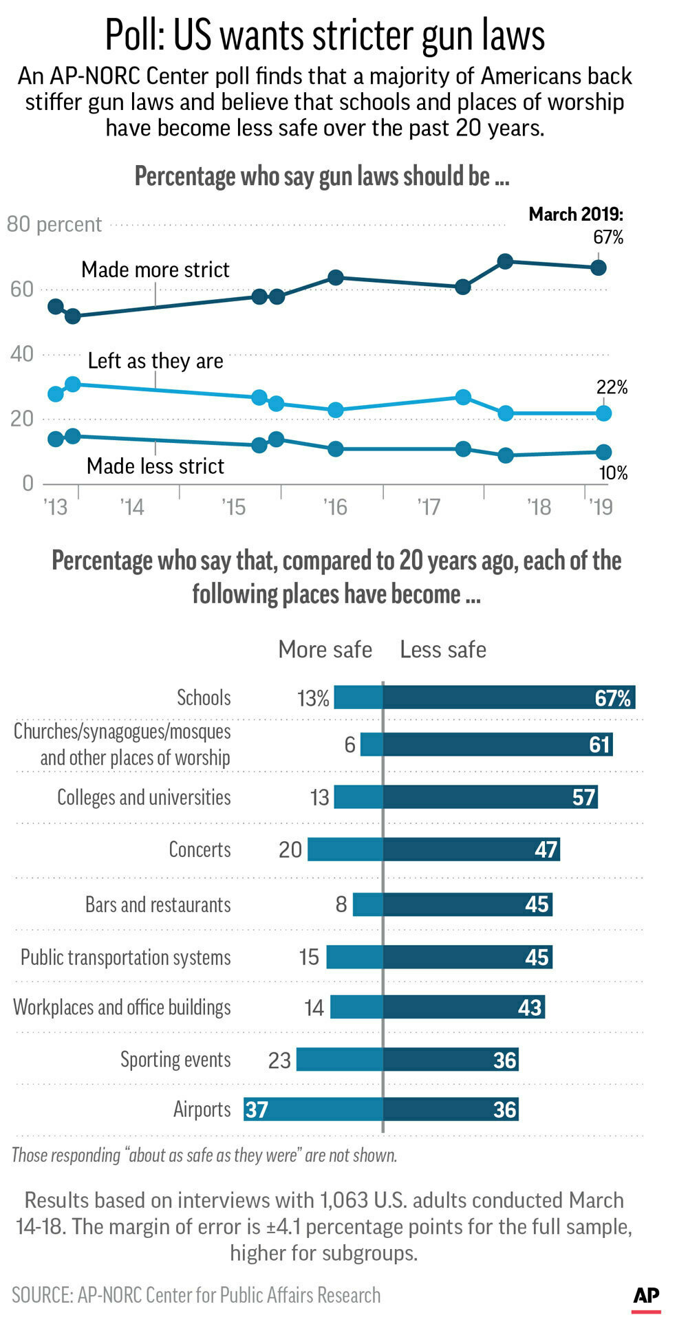 WASHINGTON – A majority of Americans favor stricter gun laws, and most believe places of worship and schools have become less safe over the last two decades, according to a new poll conducted by The Associated Press-NORC Center for Public Affairs Research.